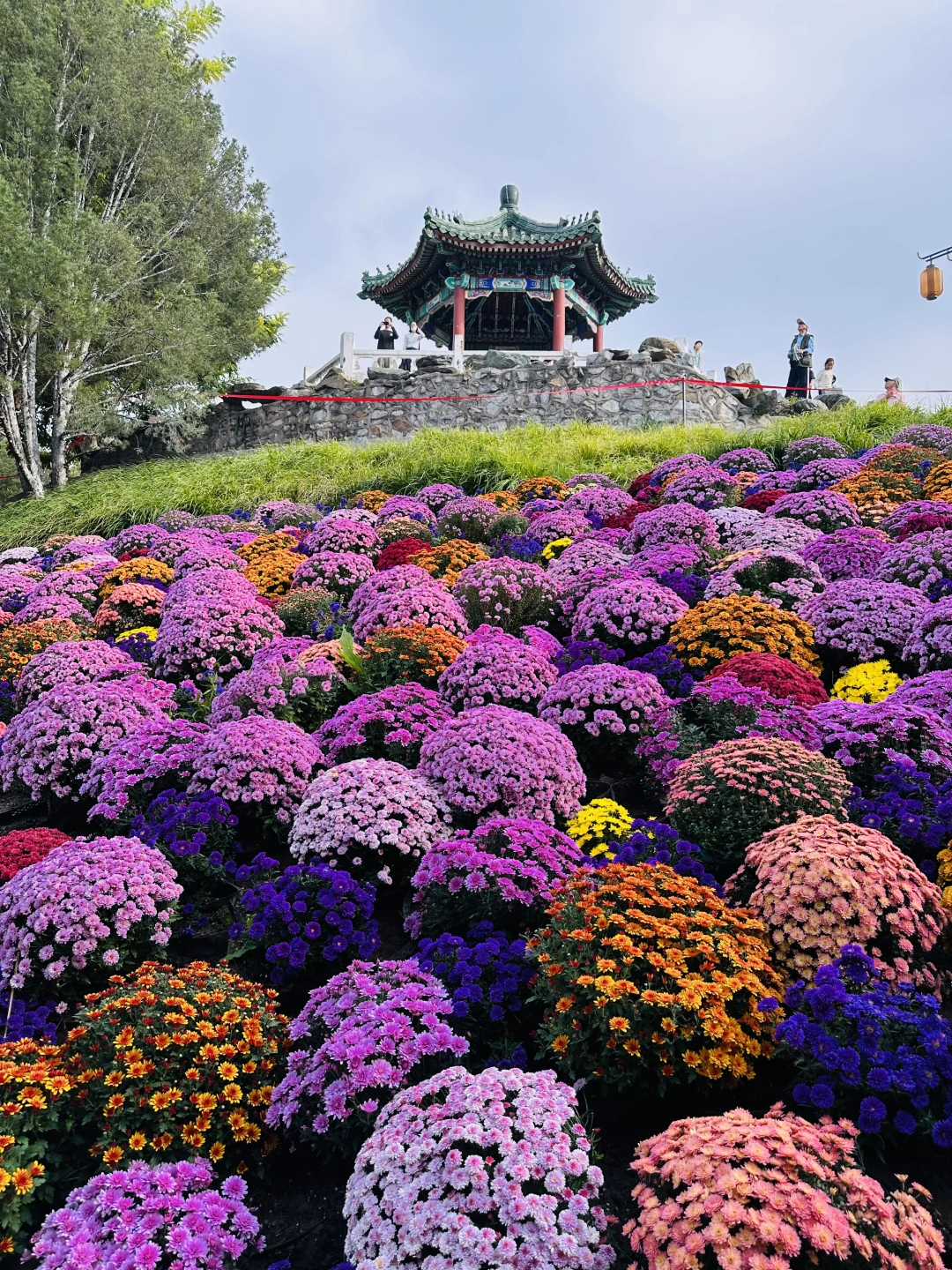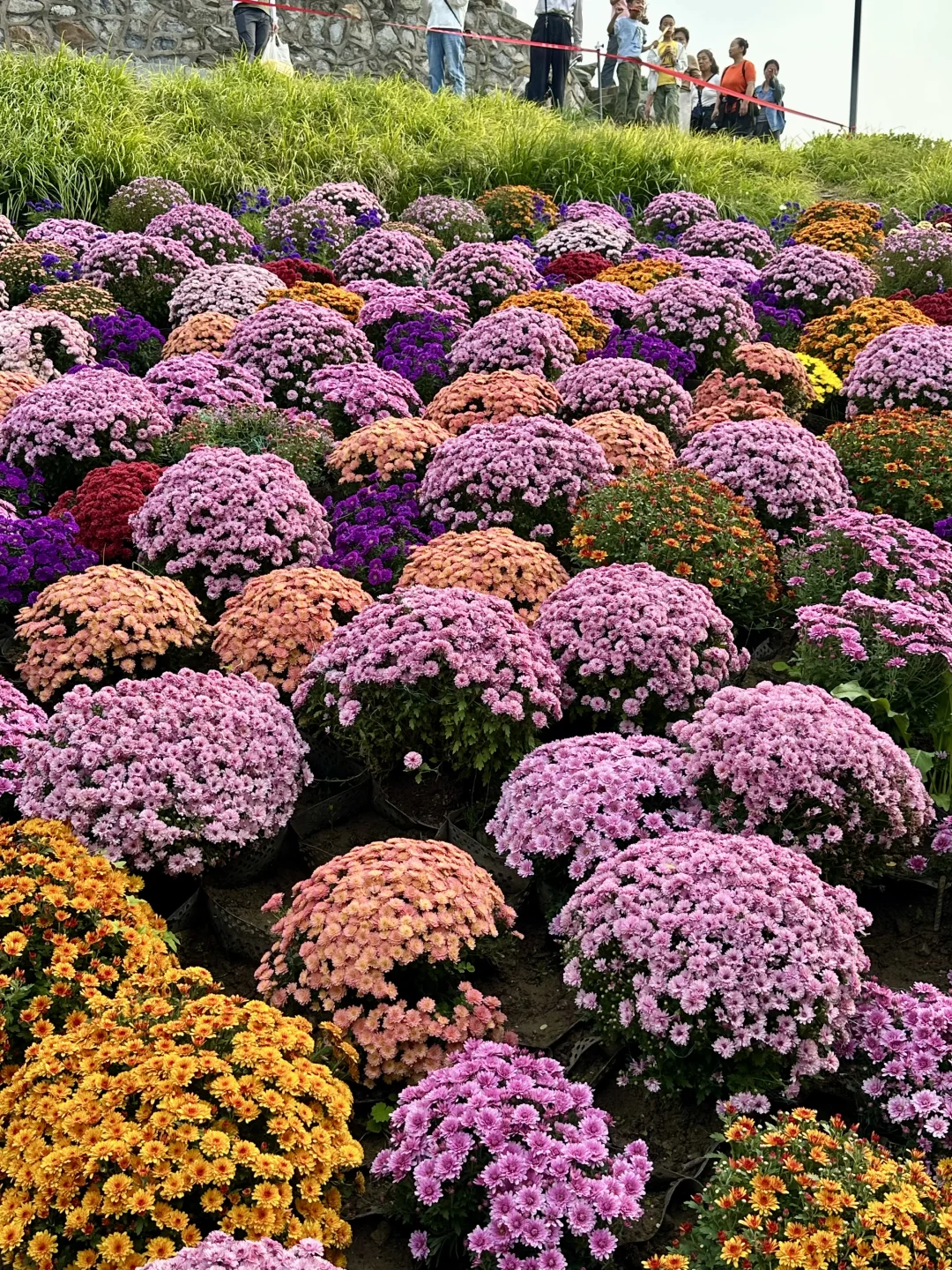 • 花海暴击:粉、紫、橙、黄…各种颜色的菊花组团盛开,像打翻了的调色盘🎨 大片花簇层层叠叠,随便一拍都是杂志大片既视感!