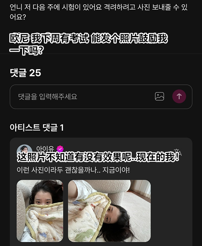 为鼓励粉丝考试考出好成绩,IU刚刚上传的自拍[嘻嘻]