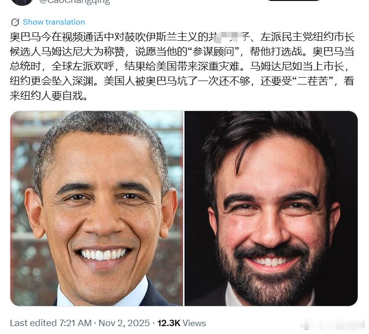 NYT:前总统巴拉克·奥巴马周六致电佐兰·曼达尼,并表示愿意作为导师和顾问保持联