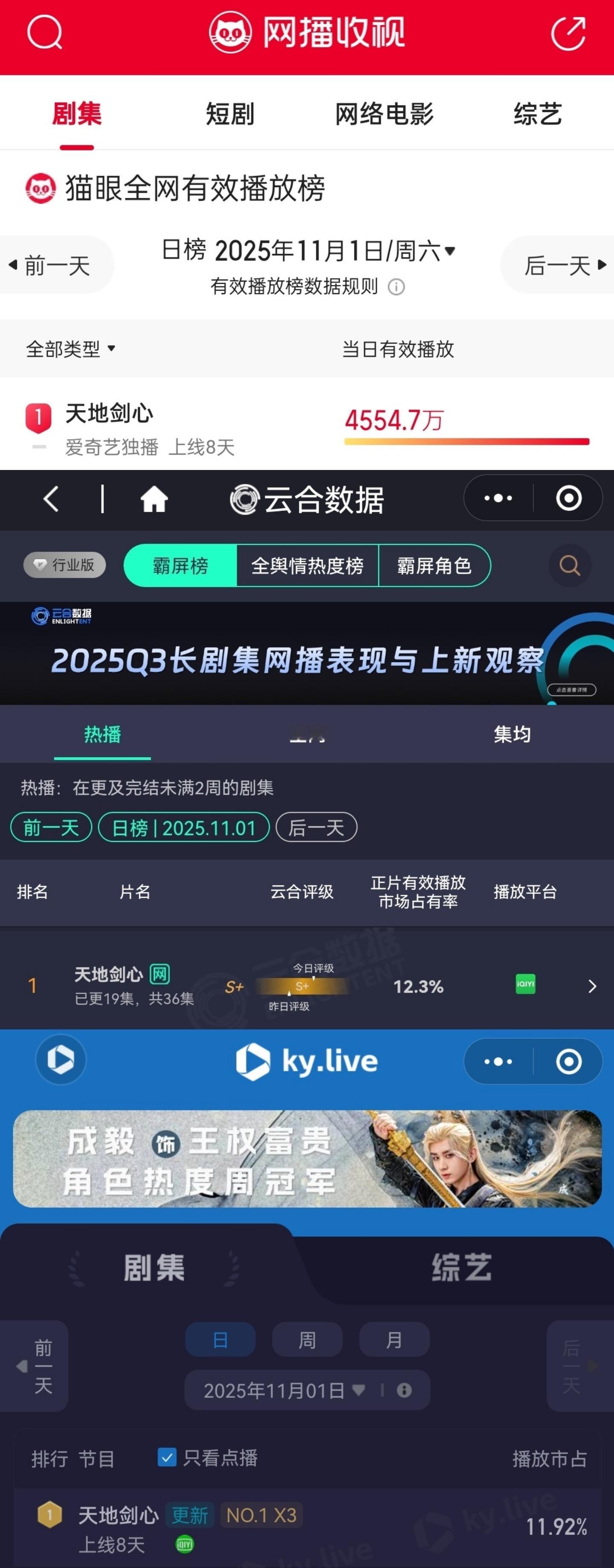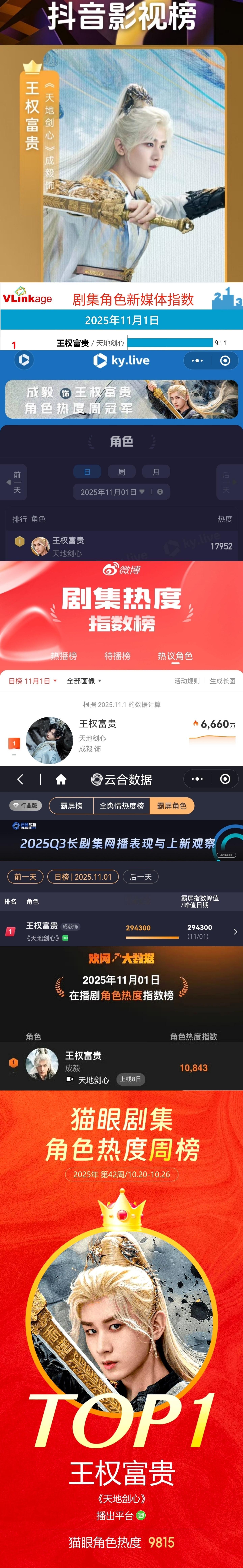 成毅王权富贵蝉联霸榜抖、V榜、酷云、猫眼、微博、欢网、云合全网各大平台热度第一🐮人抬剧带领天地剑心登顶全网播放量第一!