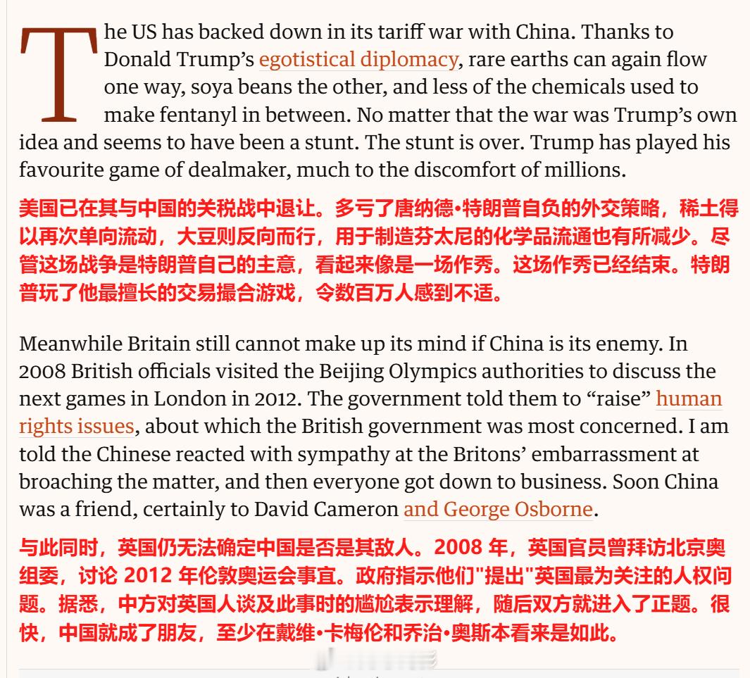 文章批评道,同样怀揣过全球幻想的英国,最应理解这种转变(美国转向“内向”),必须学会与北京的新现实共处。