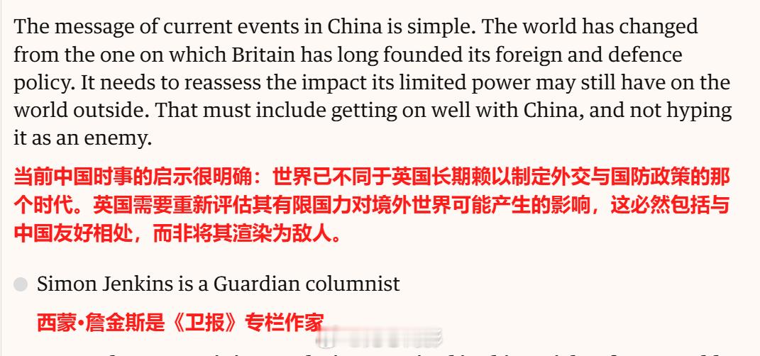 文章最后认为,英国需重新评估自身有限力量对世界的影响,适应已改变的世界格局,摒弃基于旧格局的外交和国防政策,与中国建立良好关系,避免将其炒作成 “敌人”。