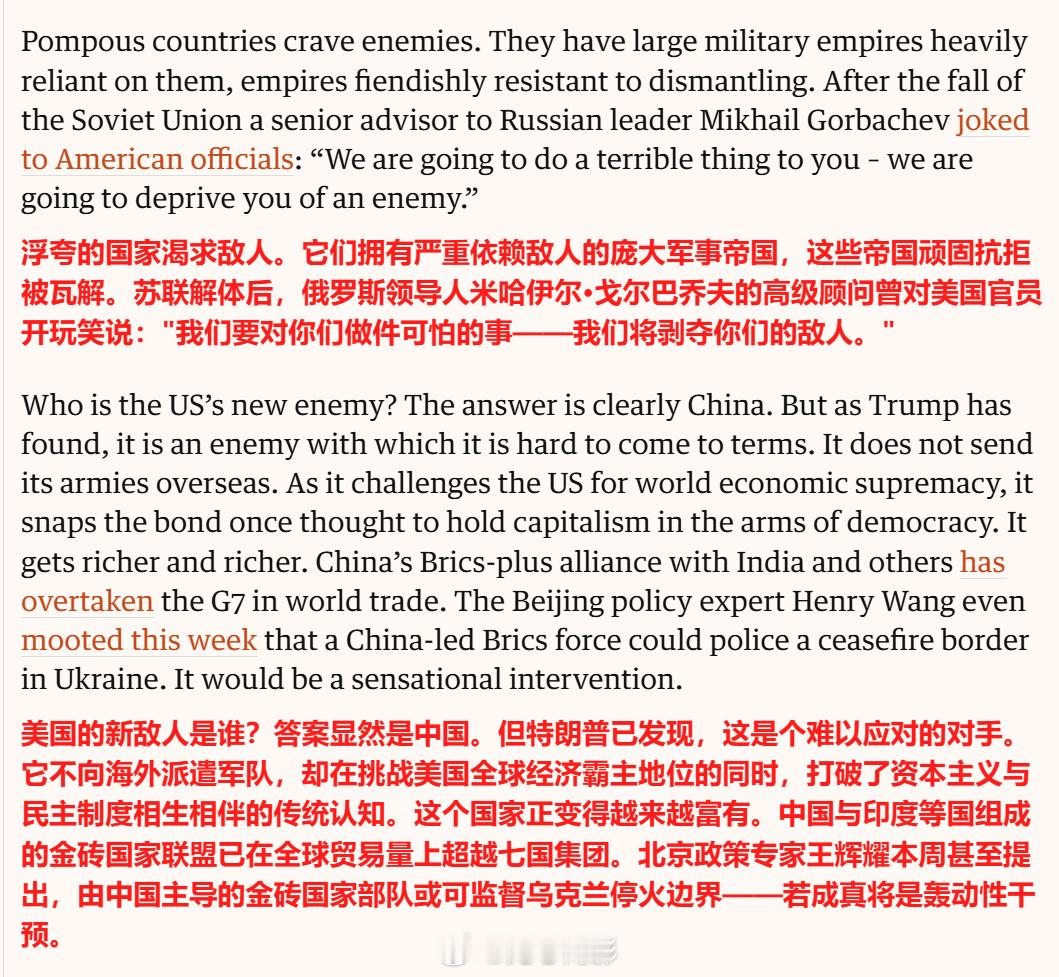 文章认为,美国的“新敌人”是中国,但特朗普发现这个对手“难以应对”,中国等国家组成的金砖国家联盟在国际上的影响力已经越来越大,贸易量更是超过传统七国集团,挑战美国主导的霸主地位。