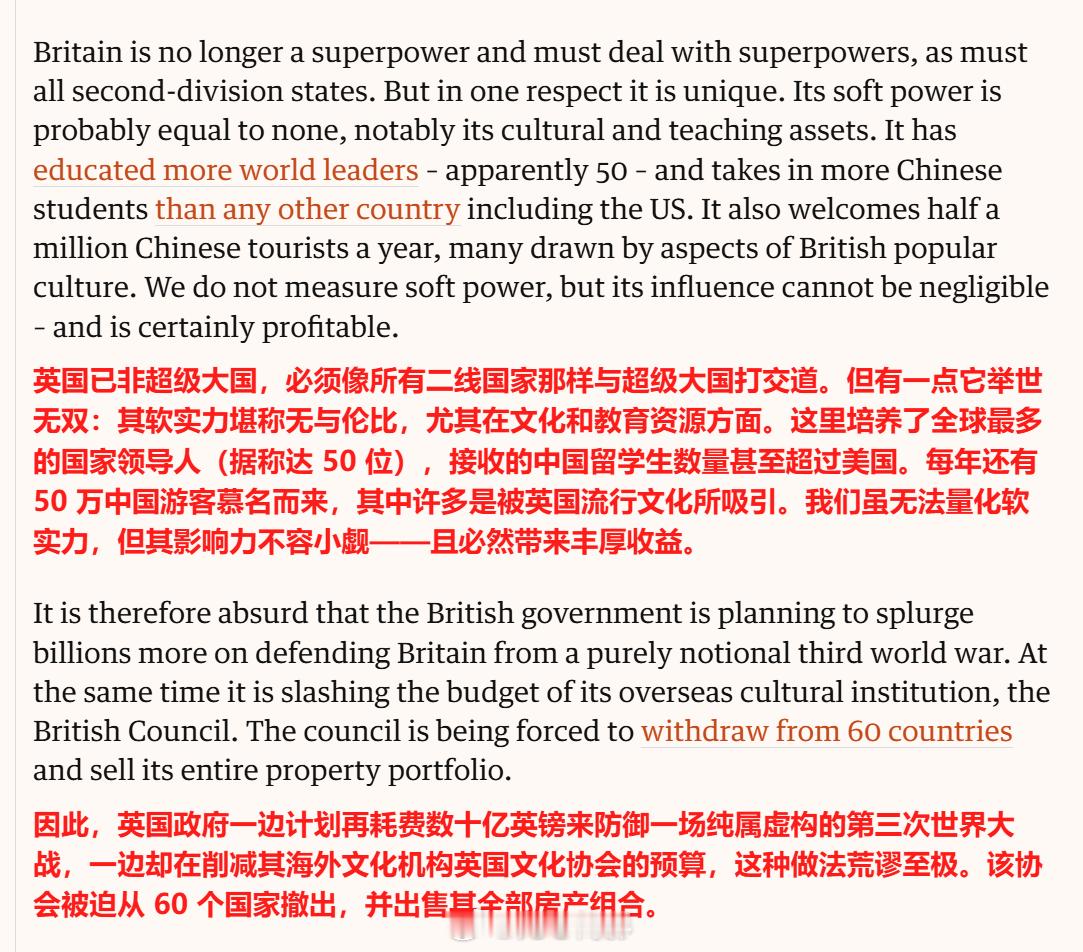 文章还指出,英国已非超级大国,必须像所有二线国家那样与超级大国(中国)打交道。但认为自己依然有实力,比如“软实力”方面(你是不是想多了?英国在中国还有什么文化影响力?),所以英国不应该每年耗费数十亿英镑来“防御一场纯属虚构的第三次世界大战”,而一边却在削减其海外文化机构英国文化协会的预算。