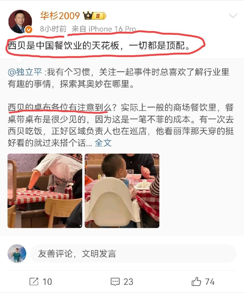 西贝近段时间的热度刚降下来一些,“华与华”老板华杉又出来作妖了,给西贝好一顿夸:西贝就是中国餐饮业的天花板…… 他还拿西贝的桌布举例,来证明西贝就是国内餐饮业里面最好的…… 网友吐槽:这个华杉和西贝贾总也是卧龙凤雏互相成就!我现在都有点怀疑了,他是不是跟贾总有矛盾啊,他是担心西贝死的还不够快。总在大家快慢慢淡忘的时候,就来这么一出。