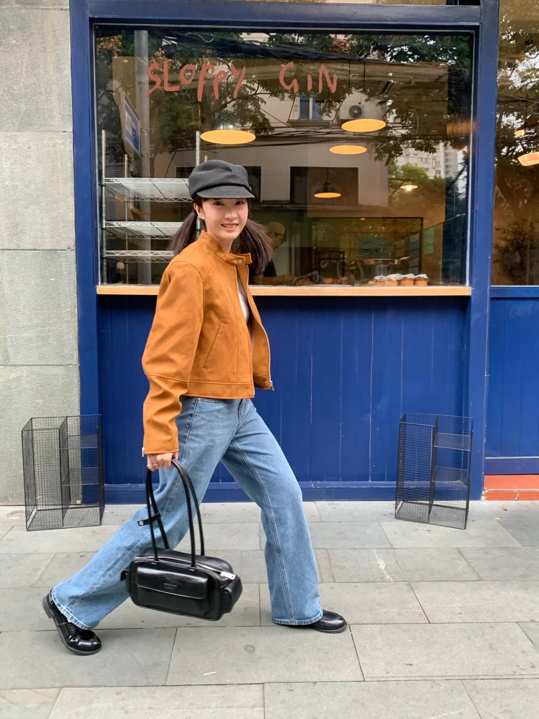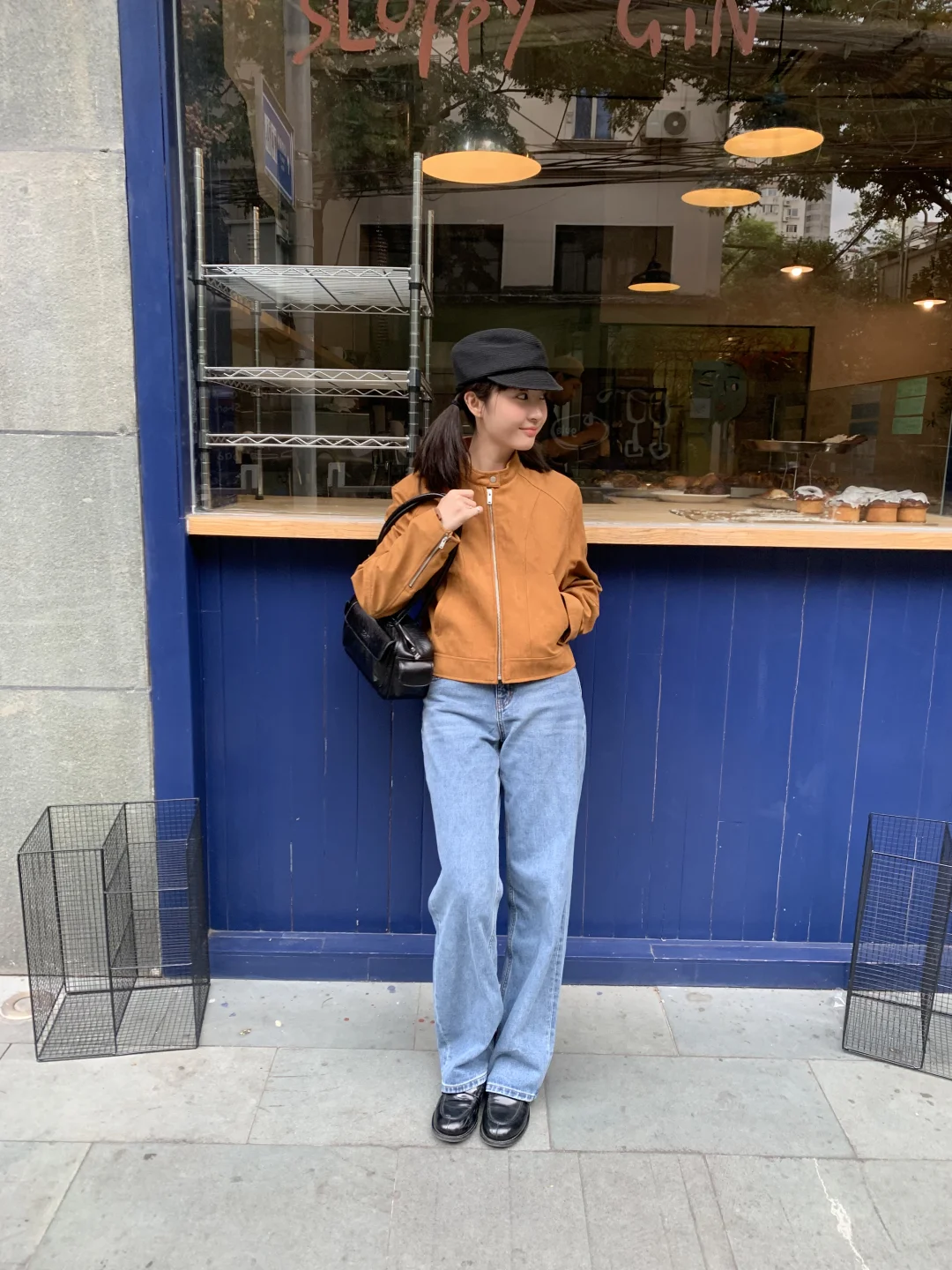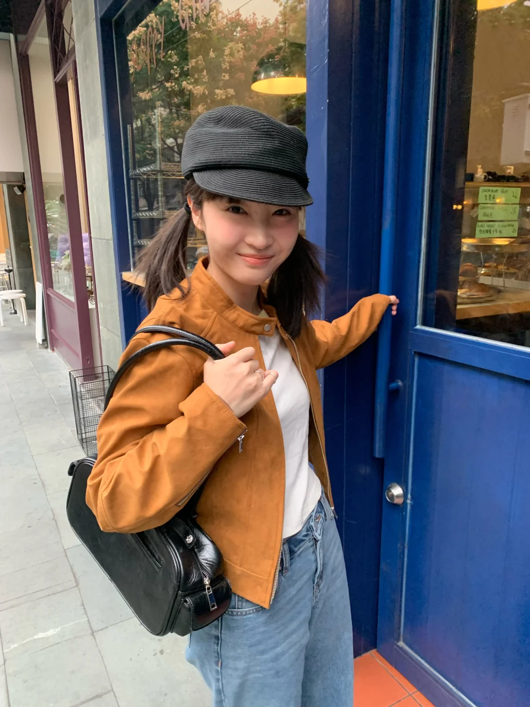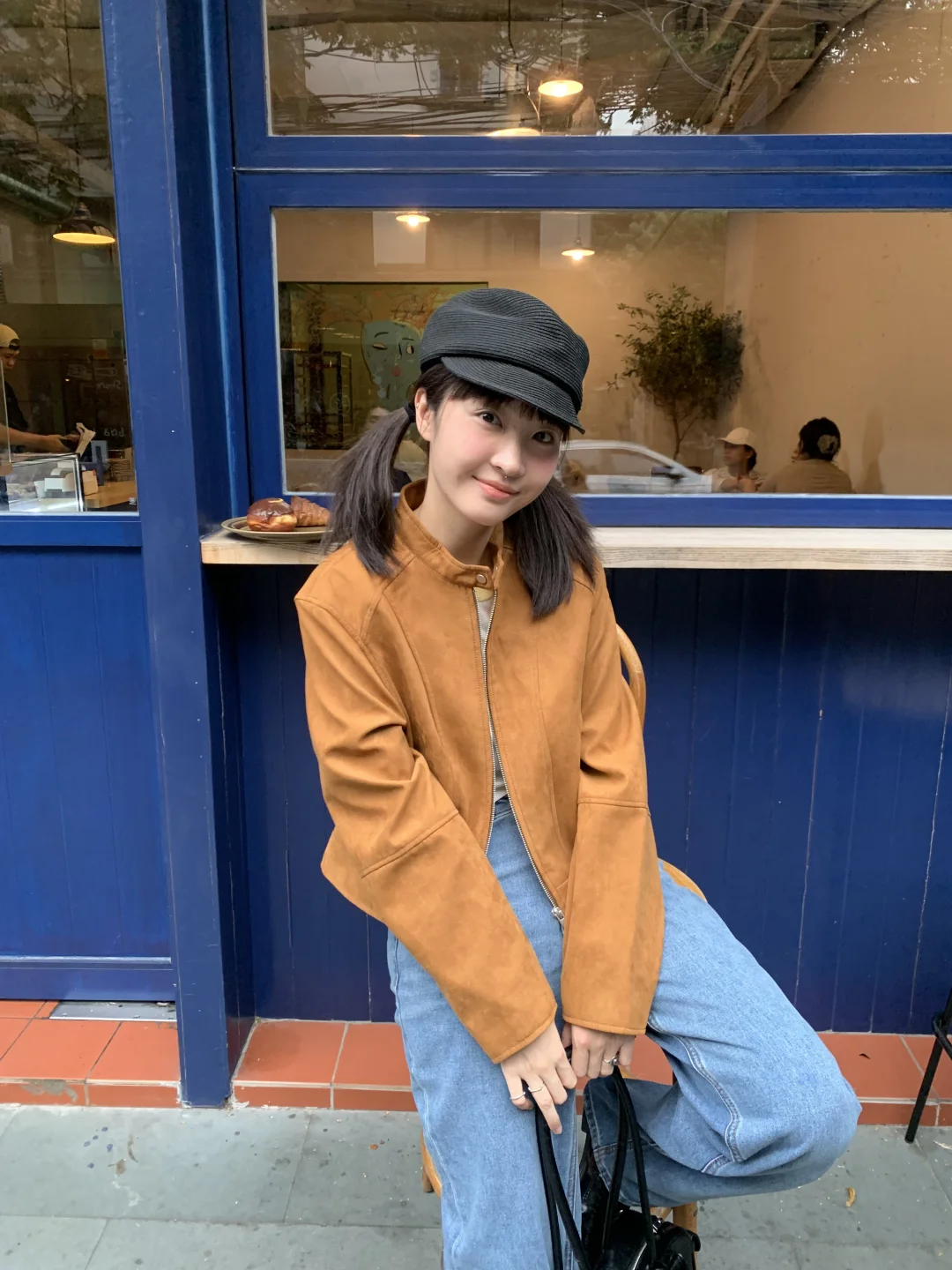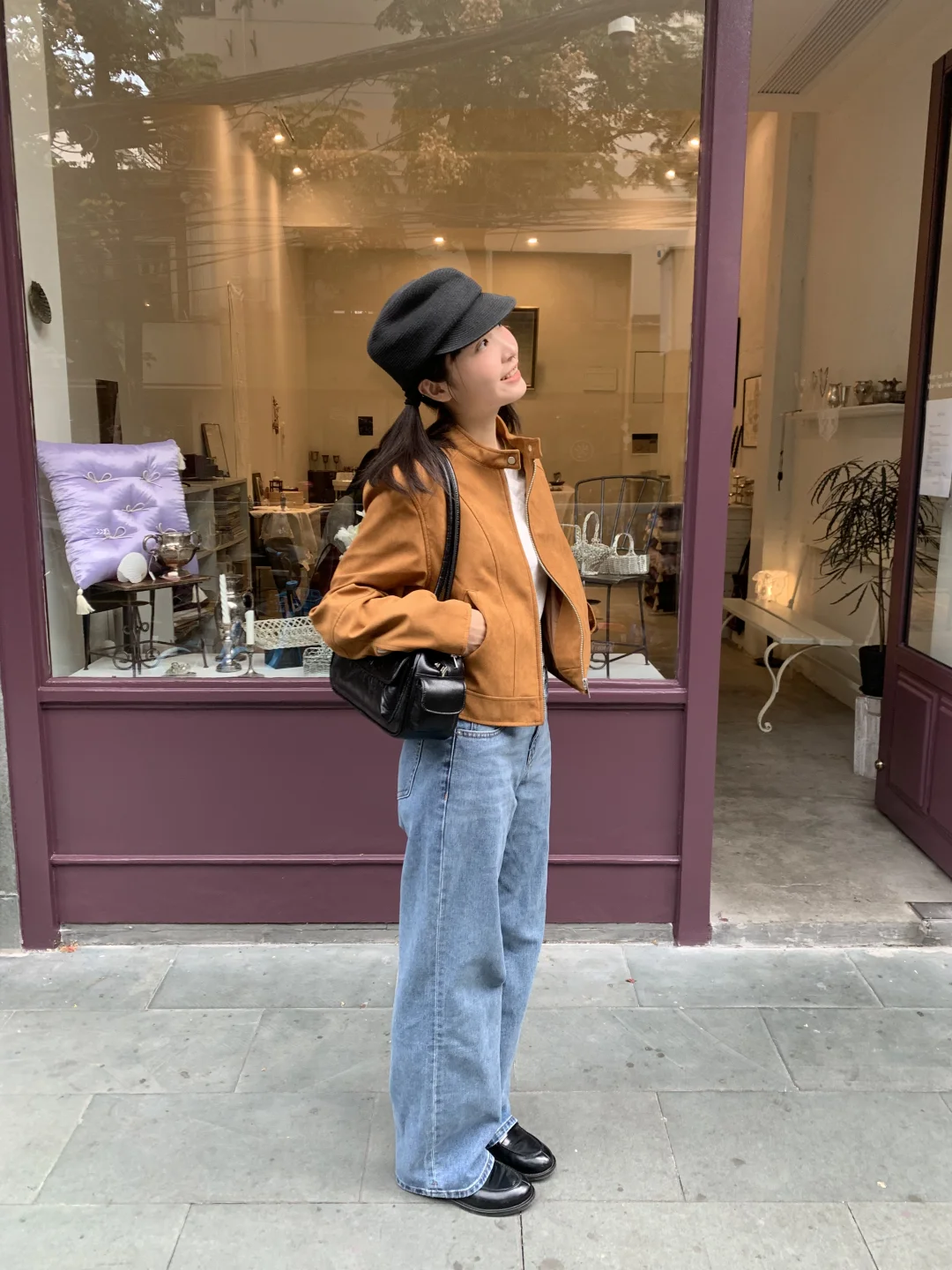 很舒适的一天 很喜欢这条街的感觉 和我今天的穿搭也很搭呢 这件焦糖色麂皮小夹克,摸起来软软的 短款的设计显得我个子都高了些。里面搭件简单的白T恤,舒服又不单调 加上了简单的牛仔裤,走起路来风一吹特别自在,配上我这顶灰色报童帽,扎个双马尾,是不是有点俏皮又复古的感觉?🤭