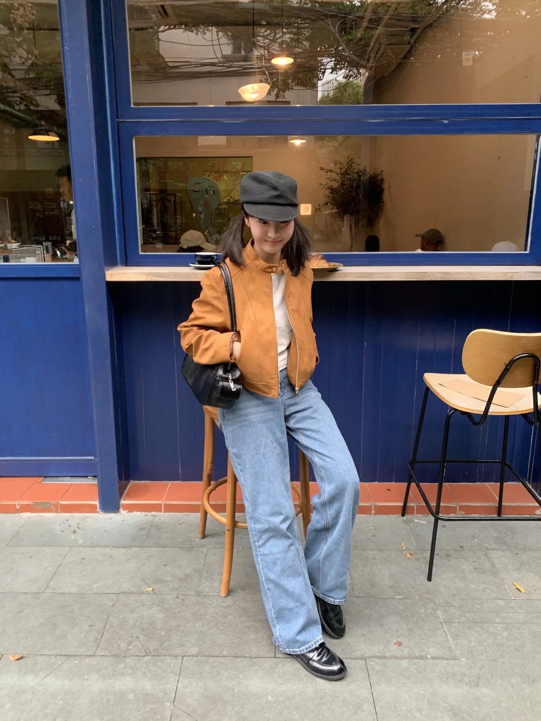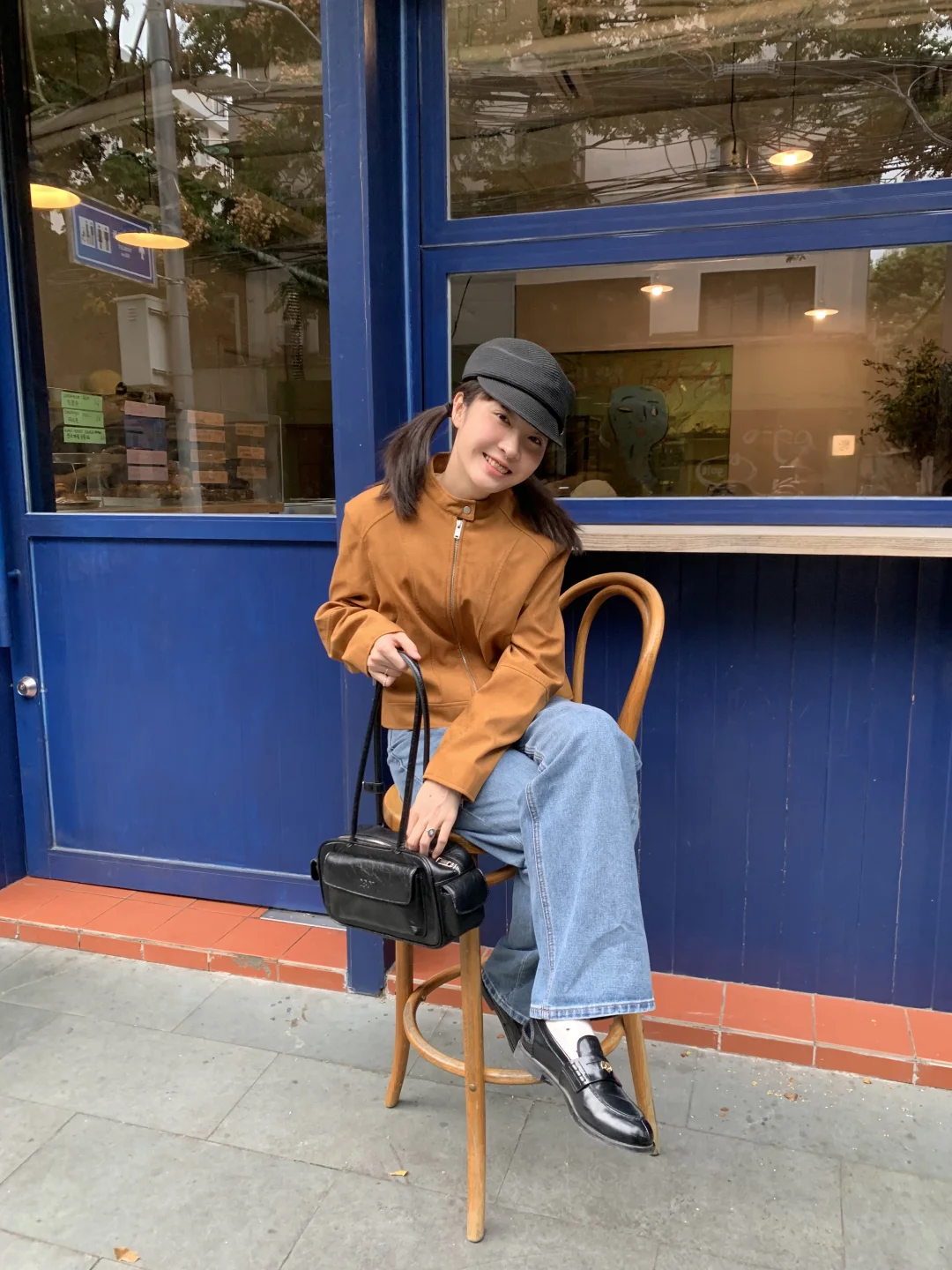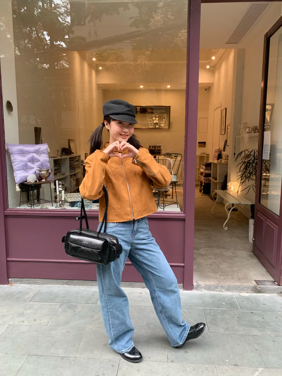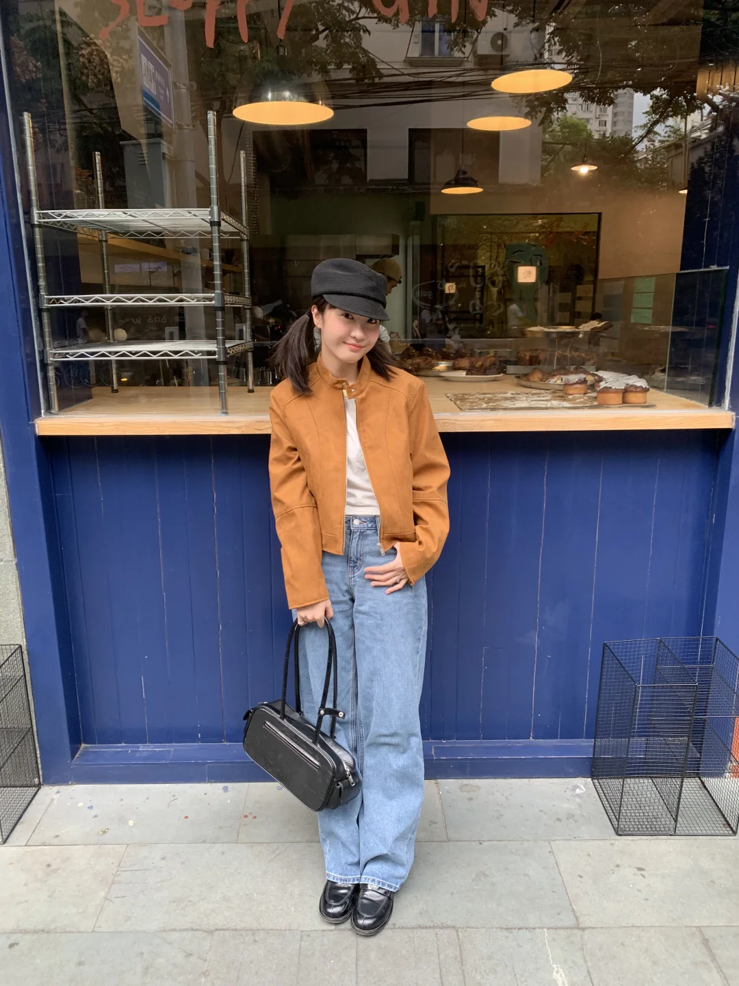 很舒适的一天 很喜欢这条街的感觉 和我今天的穿搭也很搭呢 这件焦糖色麂皮小夹克,摸起来软软的 短款的设计显得我个子都高了些。里面搭件简单的白T恤,舒服又不单调 加上了简单的牛仔裤,走起路来风一吹特别自在,配上我这顶灰色报童帽,扎个双马尾,是不是有点俏皮又复古的感觉?🤭