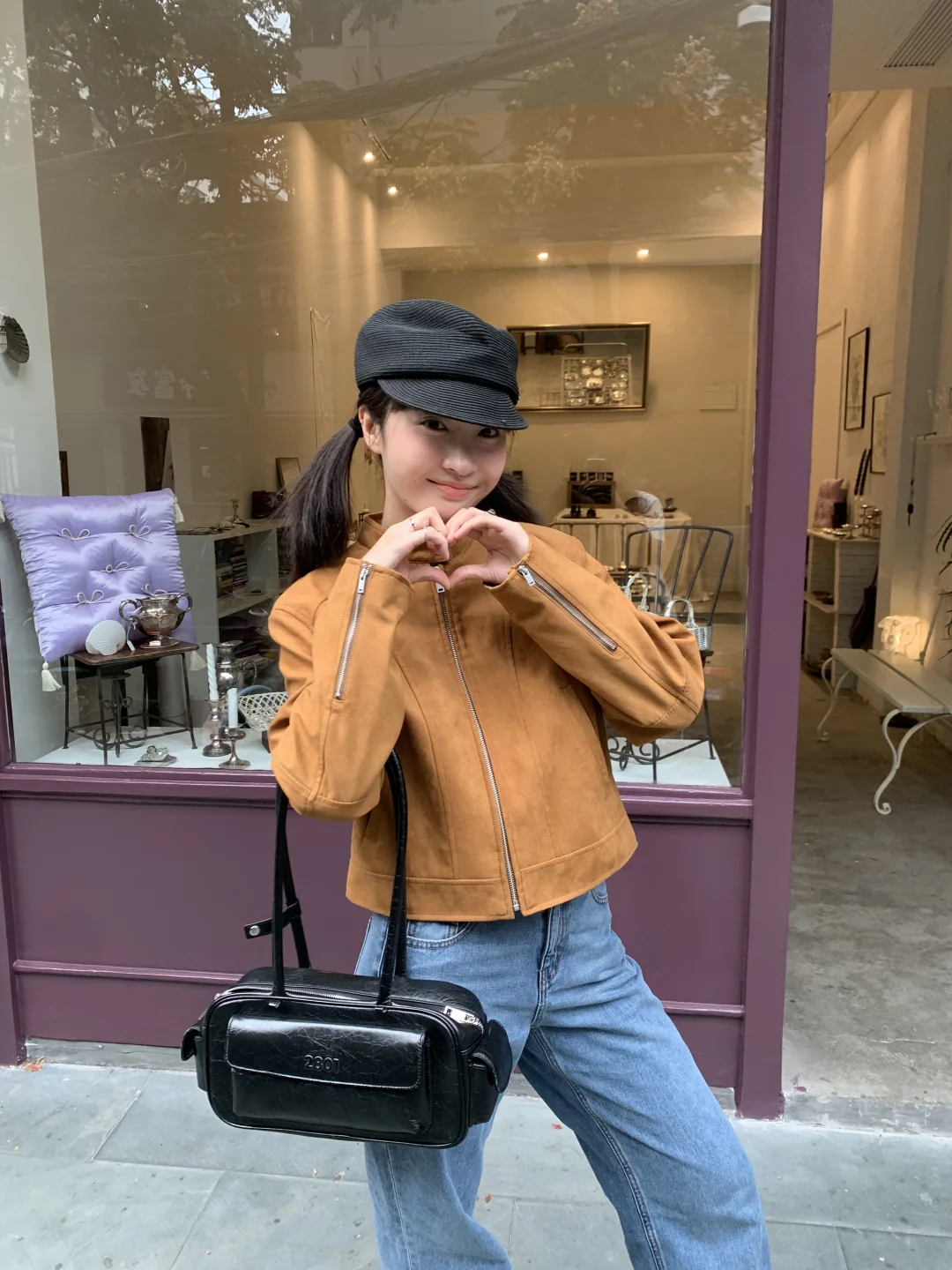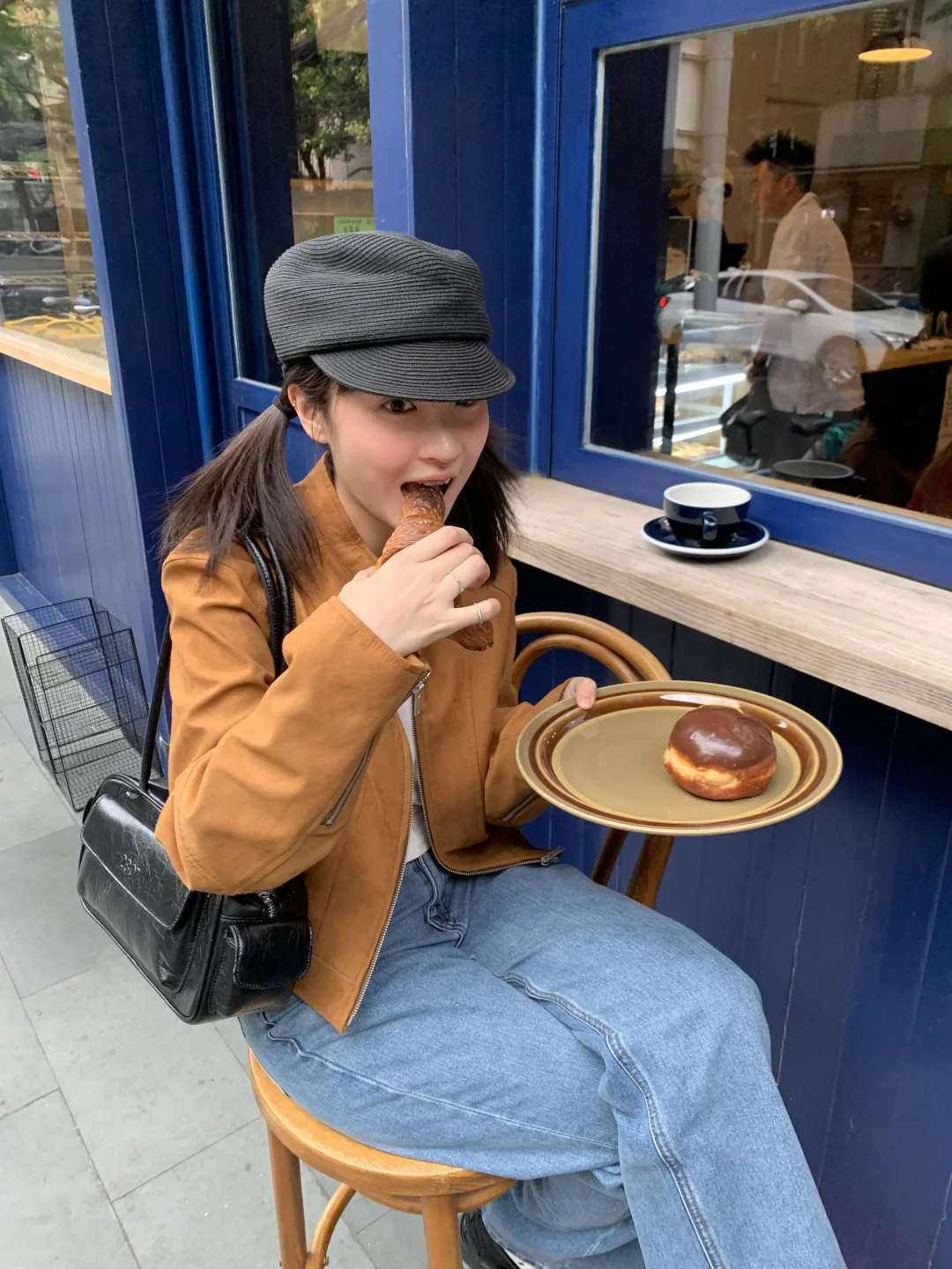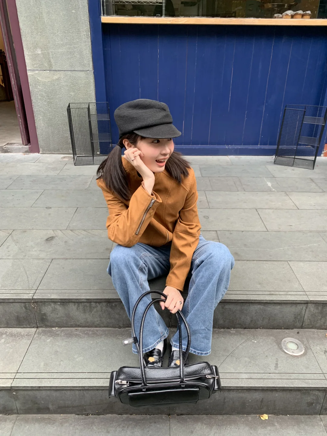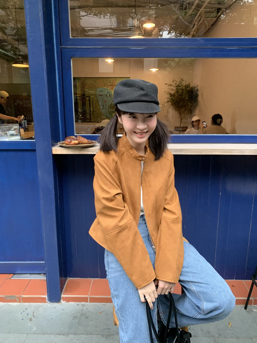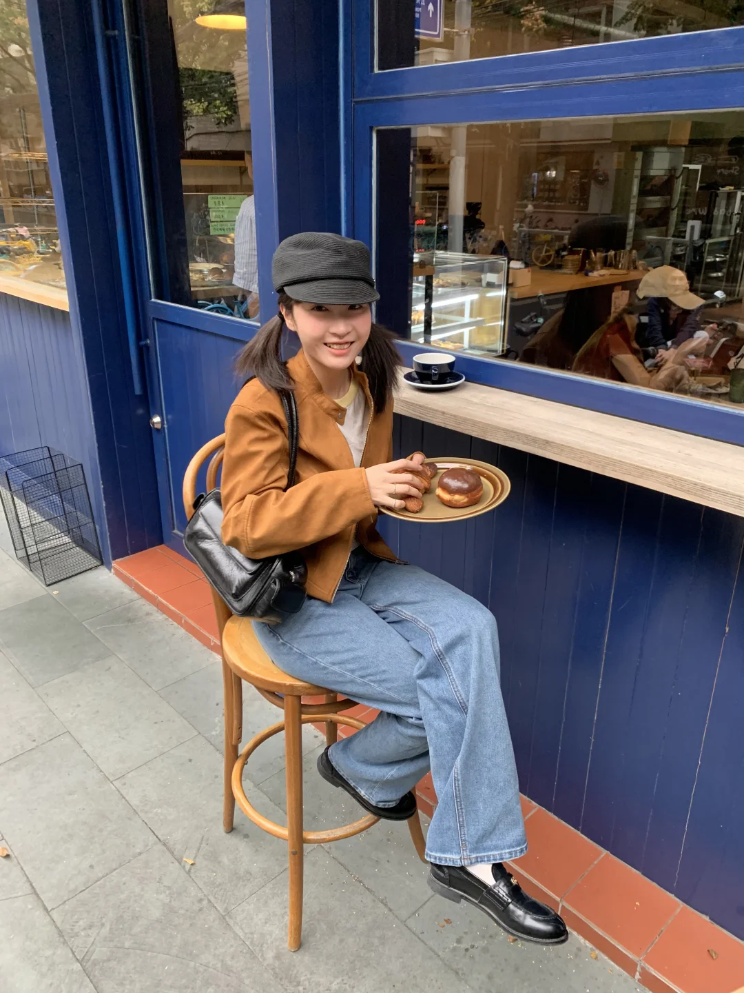 很舒适的一天 很喜欢这条街的感觉 和我今天的穿搭也很搭呢 这件焦糖色麂皮小夹克,摸起来软软的 短款的设计显得我个子都高了些。里面搭件简单的白T恤,舒服又不单调 加上了简单的牛仔裤,走起路来风一吹特别自在,配上我这顶灰色报童帽,扎个双马尾,是不是有点俏皮又复古的感觉?🤭