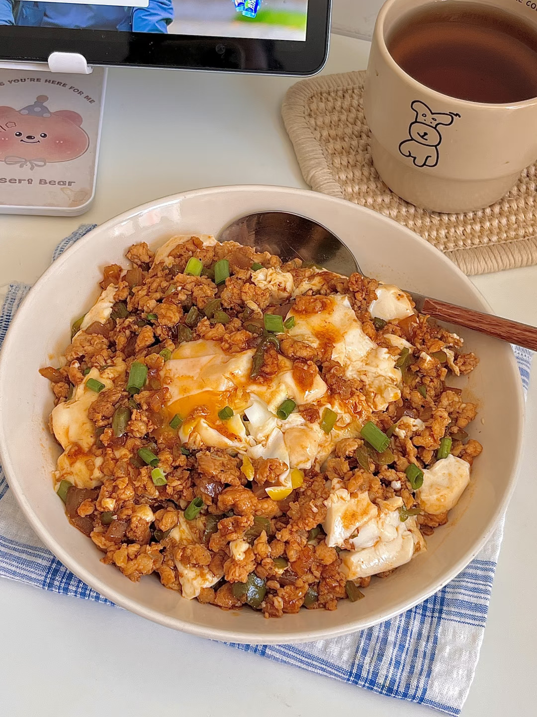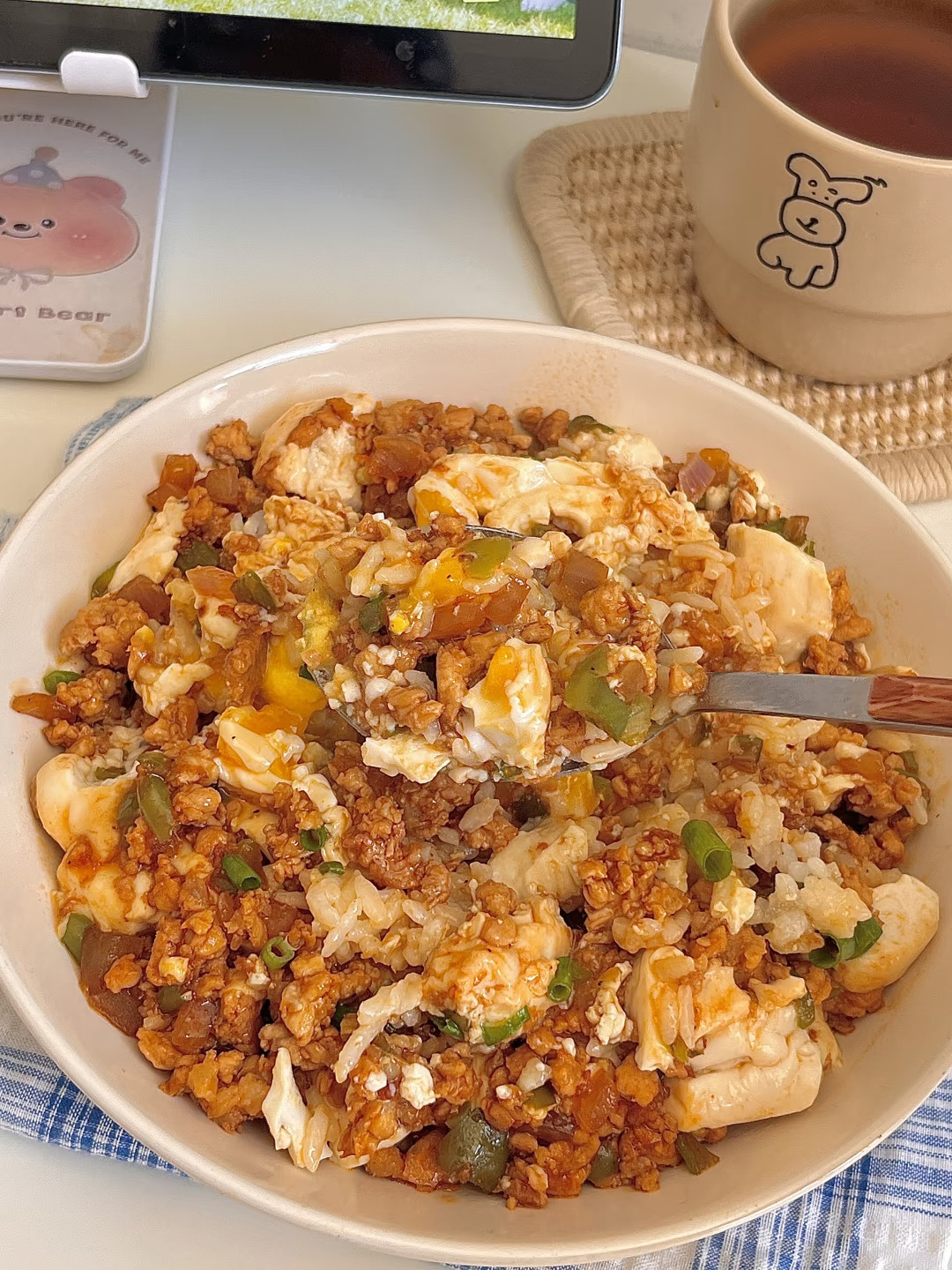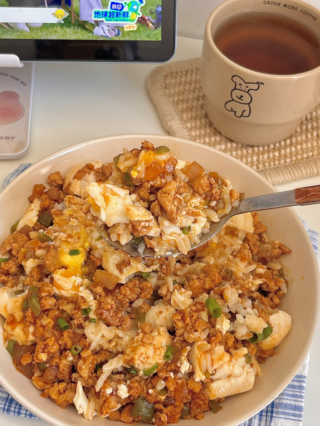 我逐帧复刻一饭封神同款 🍴今日份一人食: 肉沫豆腐抱蛋饭 大麦茶 . 肉沫鸡蛋豆腐嫩芙芙的,吸满了肉酱的香味简直太下饭啦😋拌米饭巨好吃 ~鲜香嫩滑,做法超简单,爱吃的宝快去试试呀✌🏻