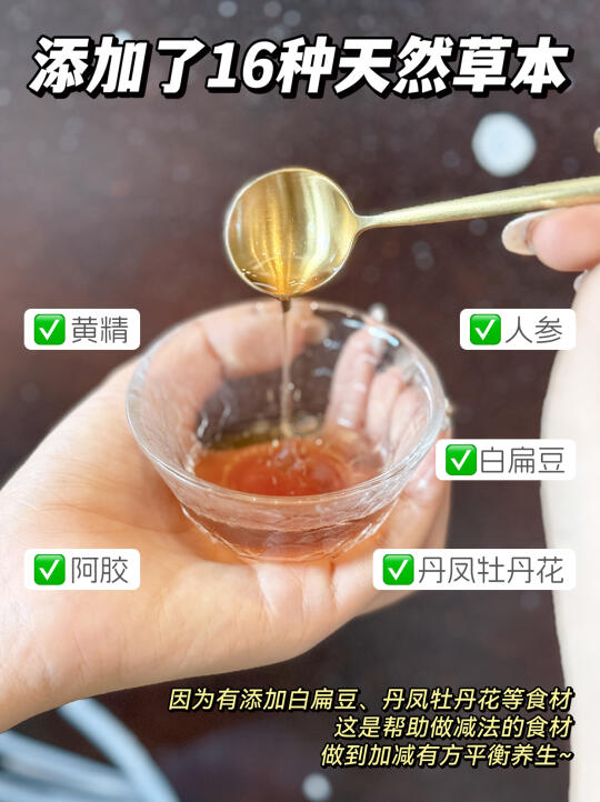 这款玉膳八珍膏满满当当添加了16种天然草本,还是从古代《瑞竹堂经验方》中的八珍汤复方化裁升级而来,虽然有多重草本的加持,但是完全不用担心会🔥🔥,因为有添加白扁豆、丹凤牡丹花等食材,这是帮助做减法的食材,做到加减有方平衡养生~