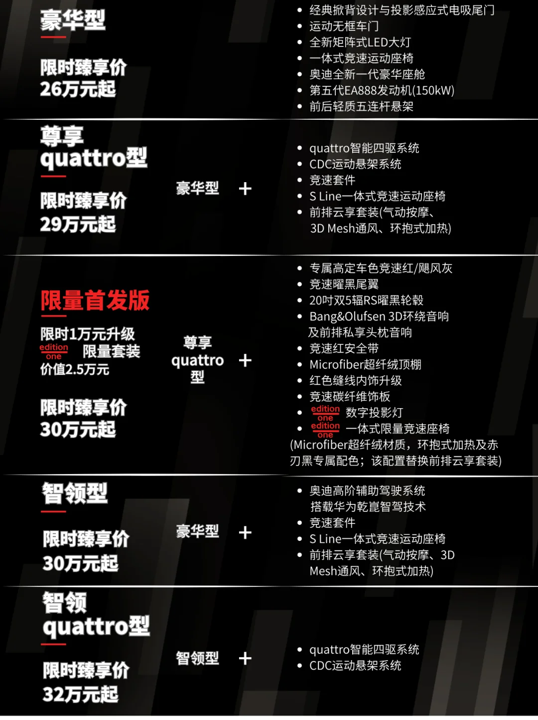 限时1w得价值2.5w首发限量版豪华配置:专属车色(竞速红、飓风灰)、曜黑尾翼、数字投影灯、曜黑尾翼、RS轮毂、红色刹车卡钳、B&O音响