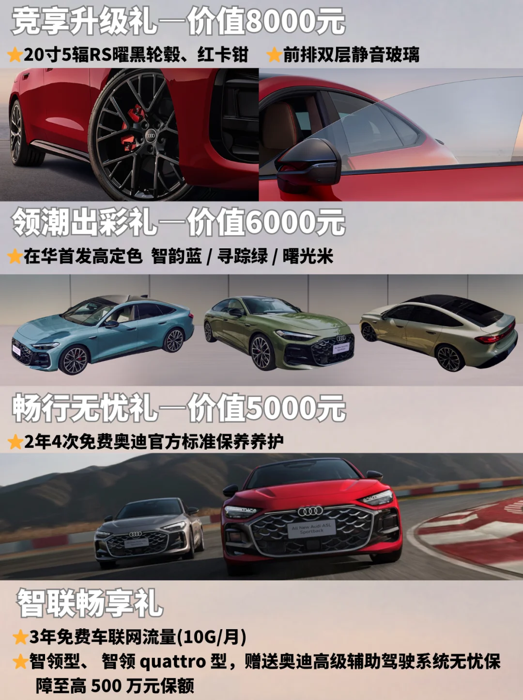 >价值1000元,全系3年免费车联网流量(10G/月),「智领型」、「智领quattro型」赠送奥迪高级辅助驾驶系统无忧保障至高500万元保额!