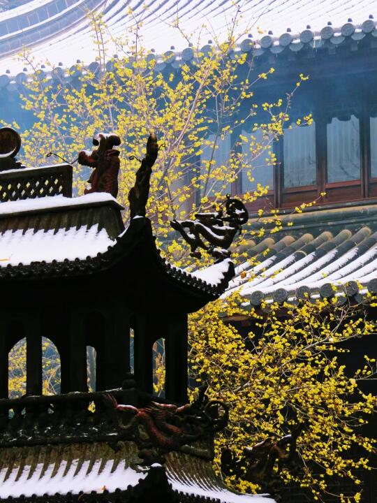灵谷寺只有一两棵蜡梅,树比较大,花开的时候满树金黄,古寺内的蜡梅别有一番意境