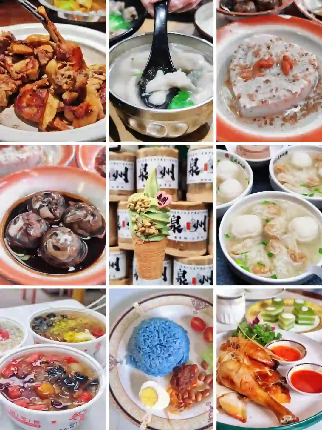 四果汤、芋头饼、姜母鸭、鱼丸汤、土笋冻、芋泥、醋肉、面线糊等