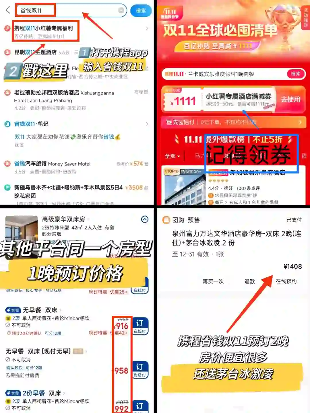 ⚠️现在上携程订酒店,正好有小红薯专属的优惠活动,在首页输入“省钱双11”,先领699减50,最高可减1111的券,再订酒店,还能再省一笔!!
