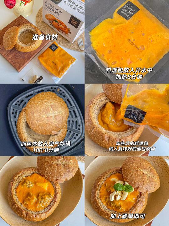 3.加热后的料理包倒入复烤好的面包碗里 加上腰果即可
