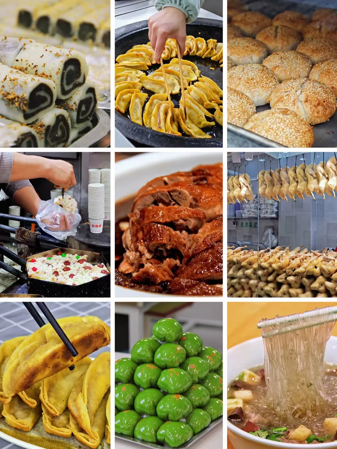 盐水鸭、烤鸭、鸭血粉丝汤、皮肚面、梅花糕、锅贴、凉粉、糖藕、赤豆元宵等
