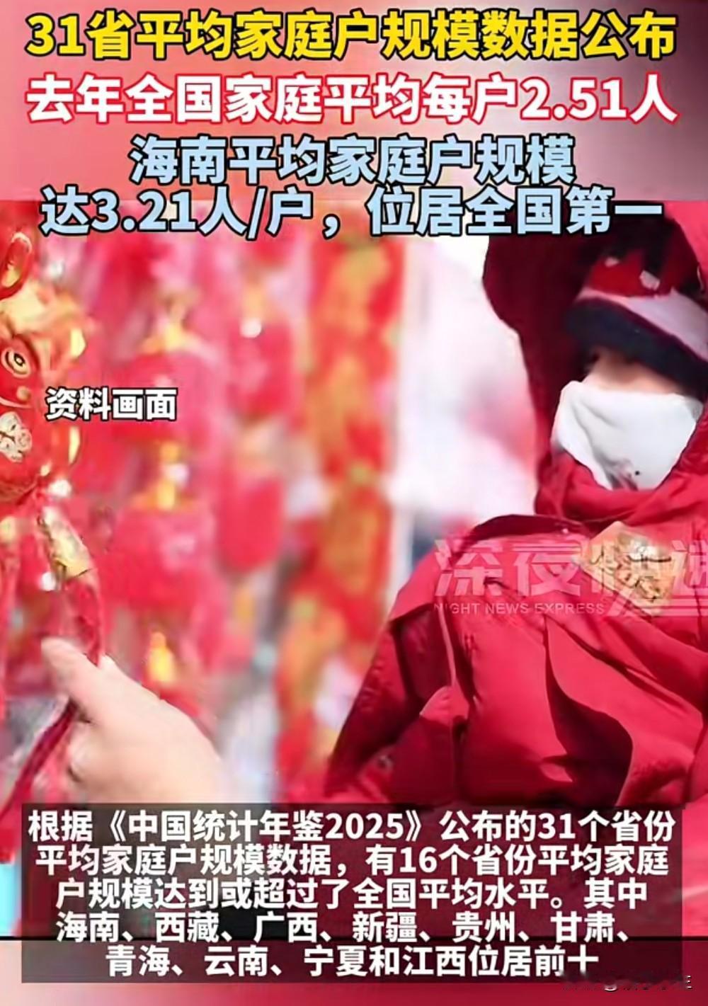 31省份平均家庭户规模数据揭晓:全国平均仅为2.51人/户,比2020年 census 数据再降0.12人。16省份达到或超过全国平均,海南以3.21人/户位居第一,黑龙江、青海紧随其后,而北京、上海分别以1.98人/户、2.01人/户垫底。 这组数据背后是中国社会结构的深刻变革:一方面,海南等省份受传统观念和生育政策影响,家庭规模较大;另一方面,超大城市的高房价、高生活成本迫使年轻人晚婚、少育、独居。贝壳研究院数据显示,2025年一线城市独居青年已达1870万,较2020年增长62%。 值得警惕的是,有儿童的家庭比重已从2000年的63.4%降至2025年的42.7%,这意味着未来劳动力供给压力将进一步加大。如何在城镇化进程中保持家庭功能的完整性,成为亟待解决的社会课题。