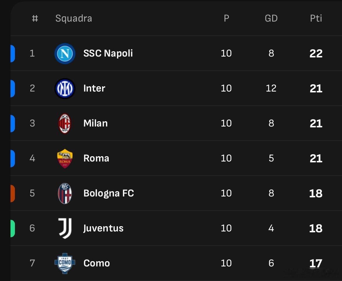 意甲10轮过后 积分榜如下ac米兰1比0罗马维罗纳1比2国际米兰热点现场