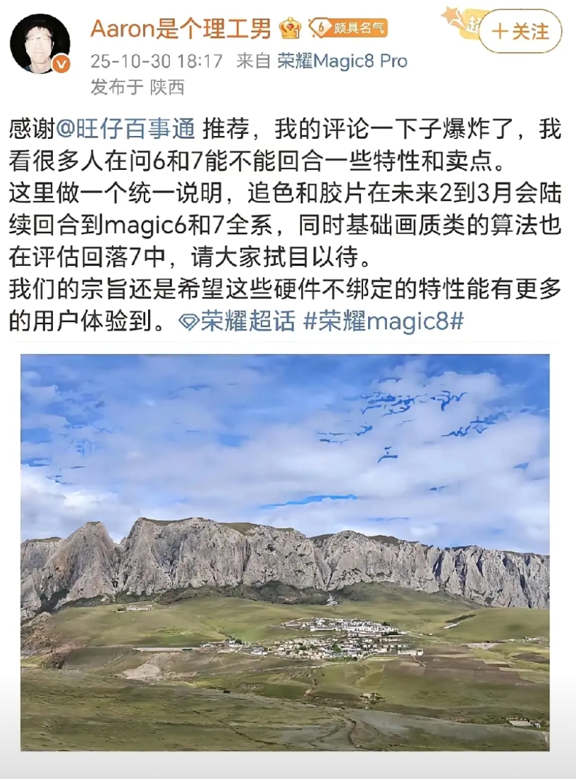 荣耀这样操作,不担心影响Magic8系列的销量吗? 官方听到买了荣耀Magic6和Magic7用户想要影像新功能,二话不说,马上就安排AI追色功能和胶片模式下放,最迟会在明年3月份给Magic6/7的机主推送新功能。荣耀真的劝,对老用户也太有责任感了,只要硬件支持的,都会安排上。