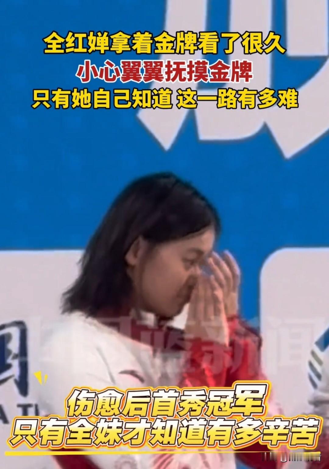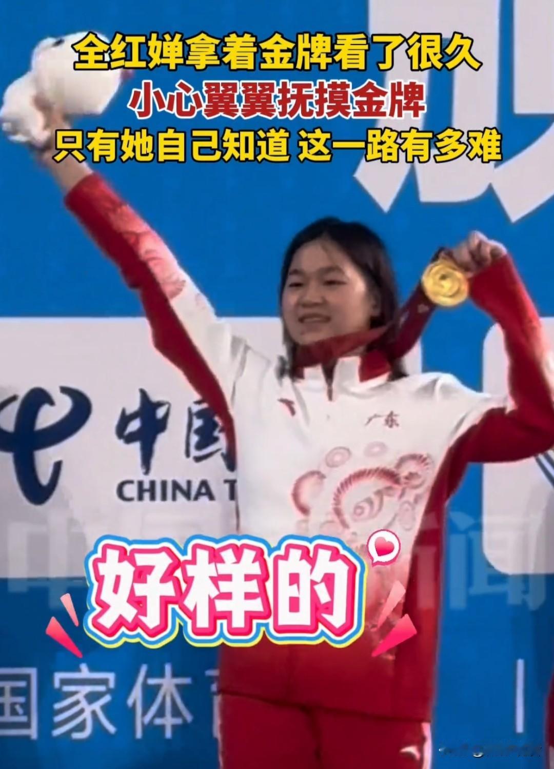 全红婵摸金牌的瞬间破防了😭看全运会颁奖礼真的被全红婵戳到心巴上了! 和搭档拿下双人10米台金牌后,她没有立刻欢呼,就安安静静低头盯着金牌看了好久,手指还小心翼翼地一遍遍摩挲纹路,那模样像在触碰全世界最珍贵的东西。 没人知道这枚金牌背后藏着多少难,左手缠满的胶布是勋章,脚踝韧带损伤、腰椎劳损的疼痛是日常,还要扛过身体发育期的挑战。183天的坚持,汗水泪水都熬成了此刻的荣光。 我觉得这就是竞技体育最动人的模样吧!为妹妹骄傲,未来继续闪闪发光✨