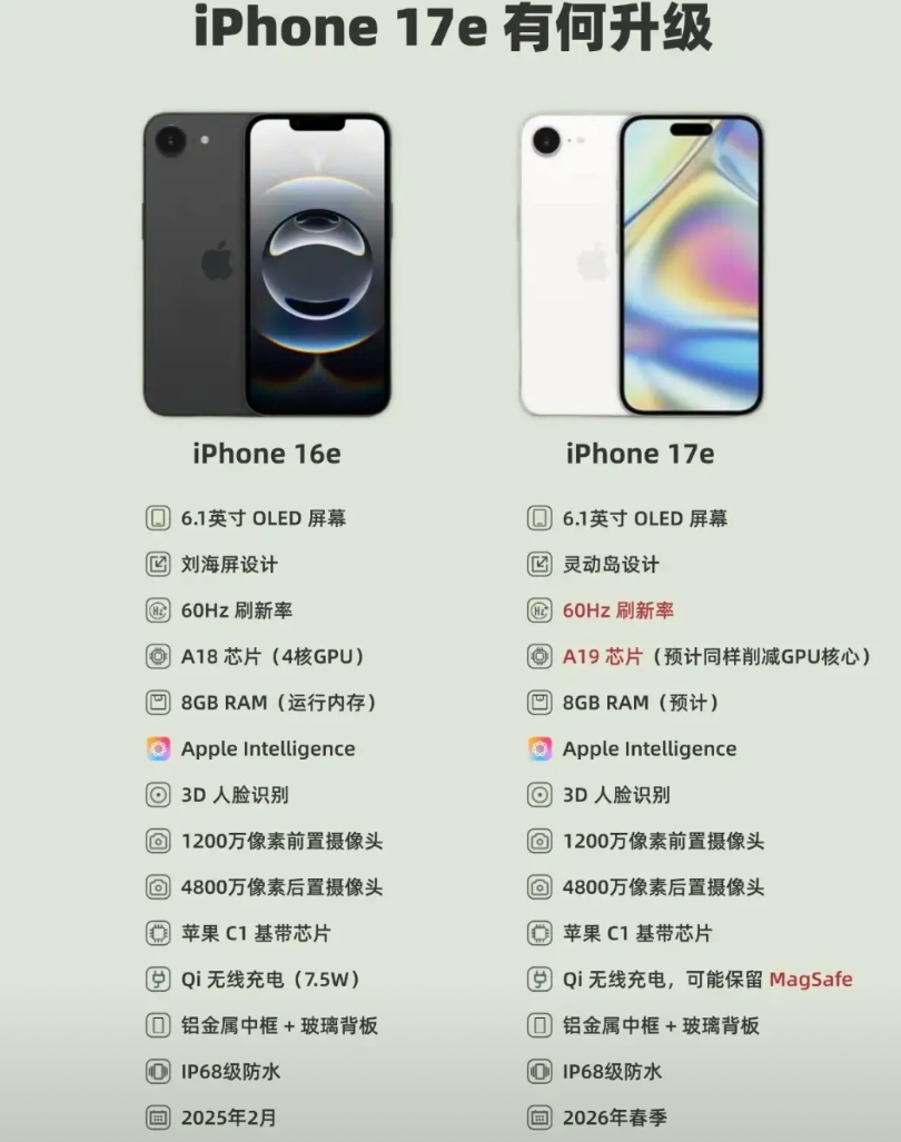 iPhone17e依然采用iPhone16e同样的屏幕尺寸,处理器从A18升级到A19,从刘海屏升级到灵动岛,遗憾的是,刷新率依然是60Hz,可能对于入门级的iPhone用户来说,续航时间长,要比高刷更重要吧,但是价格4499元已经很香了,还要什么自行车?