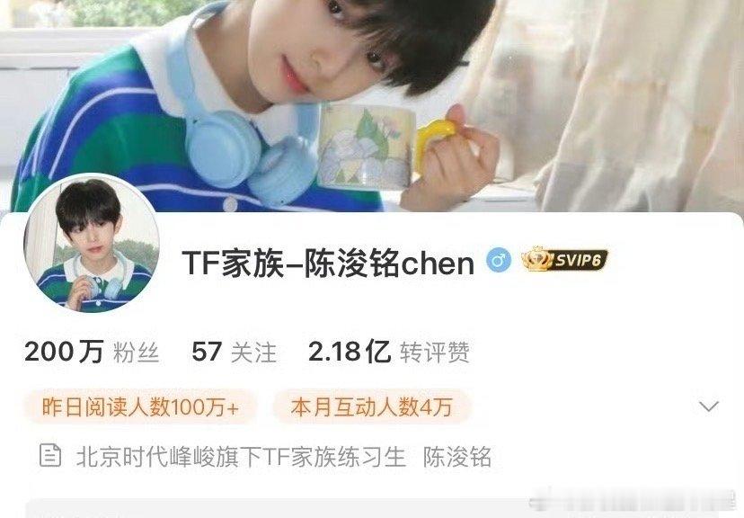陈浚铭粉丝突破200w200万份喜爱已签收!清澈歌声配扎实舞步,门面小铭的成长从不让人失望。