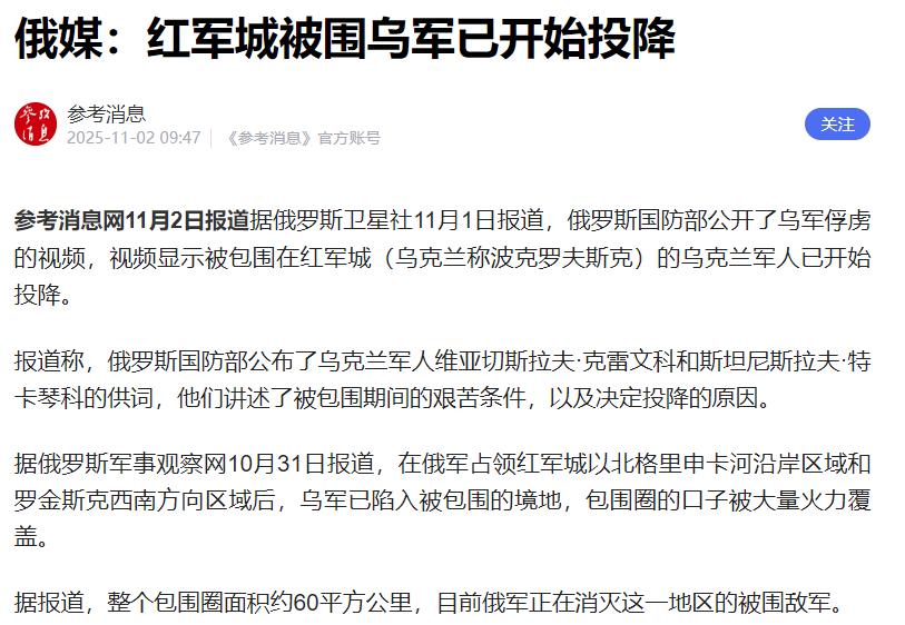 红军城包围圈第一批乌军投降了,2名乌军士兵已经投降!向俄军招供,在红军城包围圈里,非常艰苦,乌军高层冷漠,因此决定投降!   据俄军前线指挥部11月1日的消息,这两名乌军士兵顶着冷风,从战壕里爬了出来,手里还举着块白布条当白旗,走两步就打个哆嗦,一到俄军阵地前腿都软了,差点直接瘫在雪地里,那狼狈劲儿就别提了。   凑近一看,这俩士兵衣服上破了好几个洞,露出里面打满补丁的棉絮,脸冻得通红,嘴唇都裂了口子,说话声音都发颤,嘴里反复念叨着“实在撑不下去了,太苦了”。他们跟俄军说,红军城包围圈里的日子根本不是人过的,简直是“活受罪”。   红军城的乌军,每天就靠两块硬得能硌掉牙的黑面包填肚子,渴了就抓把雪放嘴里化着喝;武器更是紧张,三个人轮流用一把步枪,子弹也少得可怜,打两枪就得省着点。   最让人寒心的是上头不管他们的死活,有个战友腿被子弹打穿了,想申请点止痛药和绷带,催了三天都没消息,最后只能用破布条缠巴缠巴,疼得直哼哼。这种不管不顾的冷漠,彻底让他俩没了抵抗的心思,干脆就决定投降了。   这俩人投降,其实也是乌军现在处境的一个小缩影。明眼人都能看出来,现在的乌军早就没了之前的劲头。   先说最实际的,武器和资金都缺得厉害。前线士兵连件厚实的衣物都没有,好多人穿着单鞋在冰冷的战壕里站岗,脚都冻肿了;重武器更是拆东墙补西墙,有的连队把损坏装甲车的零件拆下来拼凑,勉强凑出几辆能开动的。   更何况,泽连斯基政府还在搞“无限制征兵”,不管是刚毕业的学生还是五十多岁的大叔,就算是智力不正常的,只要抓着就往部队送,新兵连枪怎么瞄准都没学会,就直接拉到前线当“炮灰”,这样的兵哪有什么战斗力?   士兵们天天又冷又饿,看着身边的兄弟一个个倒下却没人来救,谁还有心思打仗?以前可能还凭着一股劲硬撑,现在连活下去都成了难题,投降自然就成了不少人的想法。   就说红军城这地方,守了这么长时间,现在被俄军围得像铁桶一样,吃的穿的用的都运不进来,补给线断了好几天了,里面的人就算想抵抗,也没那个力气了,陷落也就是早晚的事。   现在乌军面对俄军的推进,也是越来越力不从心。本来人手就不够,装备又跟不上,士气还低得要命,俄军一步步往前压,他们根本没什么像样的还手办法。   这俩士兵投降,就像是个信号——红军城包围圈里的乌军防线,已经快顶不住了。   照这个势头下去,后面估计还会有更多乌军士兵选择放下武器,毕竟谁也不想在这没希望的战场上白白丢了性命。