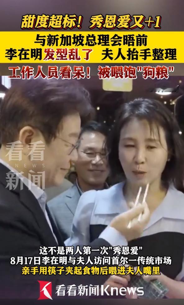 李在明跟妻子也是十分的恩爱,夫妻两人之间的感情,不比尹锡悦和金建希差!有媒体就拍到,与新加坡总理会晤前李在明发型乱了,其夫人抬手帮忙整理,工作人员都看呆了。不仅如此,我记得在8月份的时候,李在明夫妇去一家市场访问的时候,李在明当时也是亲手用筷子夹起食物后喂进夫人嘴里。种种迹象表明,这对夫妇真的很恩爱。当然,前总统尹锡悦和金建希也恩爱,但他们那种感情,远不如李在明夫妇这种的甜美和实在!