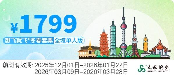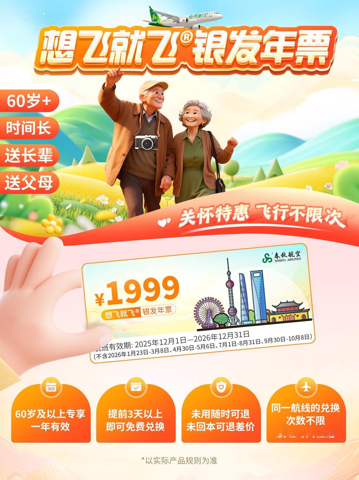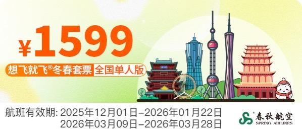 春秋航空开售想飞就飞冬春套票并首推“银发年票” 11月3日上午11时起,春秋航空APP/小程序上同步开售“想飞就飞冬春套票”与全新产品“想飞就飞银发年票”。预约用户可提前1小时购买冬春套票。 想飞就飞冬春套票:无限飞再升级 “想飞就飞冬春套票”延续国内版与全域版两种选择。国内版覆盖春秋航空9C执飞的国内(含港澳台)航线,全域版在此基础上增加国际航线,包机航线均不可用,航班有效期均为2025年12月1日至2026年3月28日。其中2026年1月23日—3月8日为不可用日期。 全国单人版1599元、全国亲子版2399元、全域单人版1799元,全域亲子版2699元。产品延续了“提前3天免费兑换、未用随时可退、未回本退差价”等核心权益。 针对老用户,春秋航空还推出限时福利:在12月12日前,2025秋冬套票用户若乘机金额达标,可在春秋航空APP/小程序活动页面领取1300元立减金,抵扣后,仅需299元即可购买本期冬春套票全国单人版。 首推银发年票:服务老年旅客 春秋航空首次推出面向60周岁及以上老年用户的“银发年票”,售价1999元。该产品可无限次兑换春秋航空9C执飞的国内(含港澳台)及国际航班机票(包机航线除外)。使用航班日期为2025年12月1日—2026年12月31日。其中,2026年1月23日—3月8日、2026年4月30日—5月6日、2026年7月1日—8月31日、2026年9月30日—10月8日为不可用日期。“银发年票”同样享有提前3天免费兑票、未使用随时退款,未回本退差价等安心保障。根据春秋旅游的数据,超70%的银发游客会选择7日以上的长线行程,这一选择既契合他们慢旅行、深度游的需求,也体现出他们对旅行品质的追求。这一趋势与春秋航空推出“银发年票”的初衷高度契合。 春秋航空表示:此次推出“银发年票”,是基于对人口结构变迁和出行需求多元化的深刻洞察。这不仅是产品线的丰富,更是服务理念的升级。我们旨在为时间充裕的老年群体创造一个“慢旅行”的友好环境,通过高性价比和灵活规则,激发“银发族”的出行潜力,这是航空服务从标准化走向人性化、精细化的重要实践 (张楚翌)