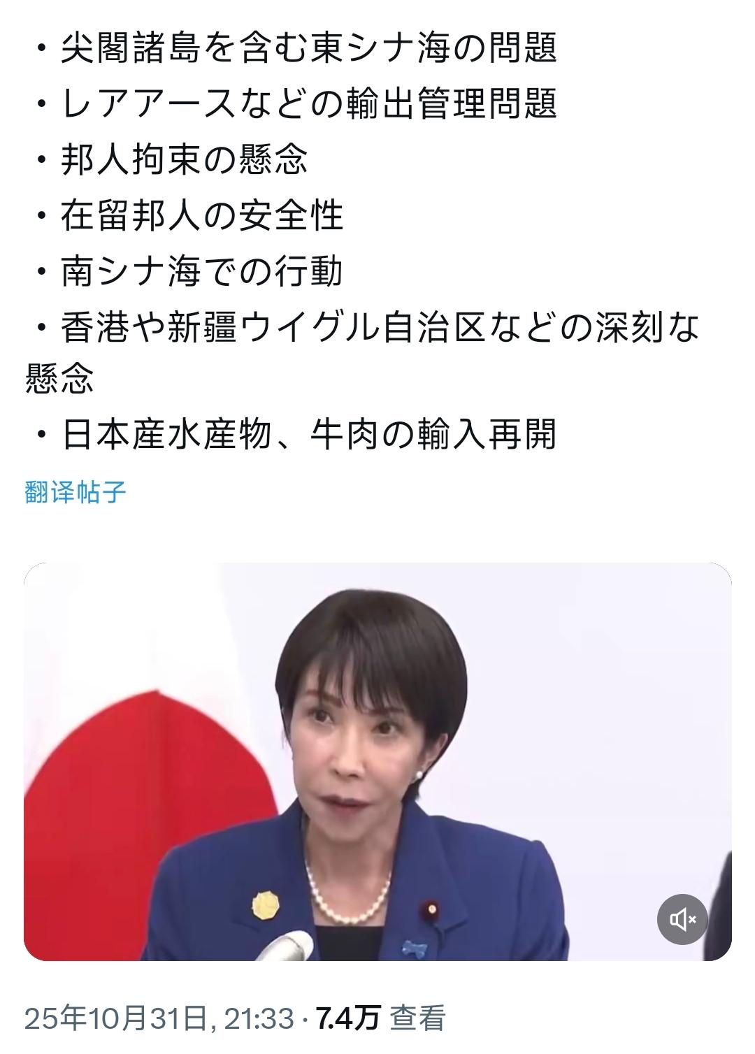 日本首相高市早苗10月31日接受媒体采访时表示,在中日会晤中,她就钓鱼岛、日本公民拘留、香港、南海和维吾尔人问题向中方提出了“严重关切”。 10月31日,日本首相高市早苗在接受媒体采访时的一番言论,如同一颗投入平静湖面的石子,在国际舆论场激起层层涟漪。在中日会晤这一重要场合,她抛出的一系列话题,涉及诸多敏感领域,瞬间吸引了各方目光。 先说说钓鱼岛问题。钓鱼岛及其附属岛屿,自古以来就是中国固有领土,这有着充分的历史和法理依据。中国对钓鱼岛拥有无可争辩的主权,这一点毋庸置疑。然而,日本方面却长期在钓鱼岛问题上小动作不断。 从所谓的“国有化”闹剧,到频繁派遣船只非法闯入钓鱼岛领海进行挑衅,日本的一系列行为严重侵犯了中国的主权和海洋权益。此次高市早苗在会晤中提及此问题,无疑是想再次在国际舆论中制造话题,试图为日本在钓鱼岛的非法行径寻找借口,这种做法完全是对历史事实和国际法的公然漠视。 再来看日本公民拘留事件。在法律面前,人人平等,无论国籍如何,只要触犯了法律,就应当受到相应的制裁。中国是一个法治国家,对于任何违法犯罪行为,都会依法进行处理。 日本公民在中国境内违法被拘留,这是基于中国法律的正当执法行为。日本方面却常常以此为借口,无端指责中国,这种做法不仅是对中国司法主权的干涉,也反映出其在处理国际事务时缺乏基本的尊重和理解。 香港问题同样不容日本方面随意置喙。香港是中国的一个特别行政区,实行“一国两制”方针,这是中国内政,任何外部势力都无权干涉。香港回归以来,在中央政府的大力支持下,保持了繁荣稳定的发展局面。 然而,一些反中乱港分子在外部势力的支持和煽动下,进行了一系列破坏香港社会秩序、危害国家安全的活动。中国政府依法采取措施维护香港的稳定和安全,这是完全正当和必要的。日本方面却打着所谓“民主”“人权”的幌子,对香港事务说三道四,其真实目的不过是想借机破坏香港的繁荣稳定,遏制中国的发展。 南海问题涉及多个国家的利益和地区和平稳定。中国在南海的领土主权和海洋权益有着充分的历史和法理依据。中国一直致力于通过和平谈判和协商解决南海争议,推动与周边国家的合作共赢。然而,日本却频繁在南海问题上刷存在感,与美国等国家勾结,进行军事演习和所谓的“自由航行”行动,试图搅乱南海局势,破坏地区的和平与稳定。 至于维吾尔人问题,这完全是美国等西方国家编造的谎言和闹剧。中国政府一直致力于保障各民族的平等、团结和发展,新疆地区在中央政府的大力支持下,经济社会发展取得了巨大成就,各族人民安居乐业。日本方面却盲目跟风美国,在毫无事实依据的情况下,对中国进行无端指责,这种做法既不道德也不负责任。 高市早苗在会晤中就这些敏感问题向中方提出“严重关切”,看似强硬,实则暴露了日本在处理对华关系时的短视和错误心态。中日两国作为亚洲重要国家,保持稳定健康的关系对于地区和世界的和平与发展都具有重要意义。 日本方面应该摒弃偏见和错误做法,以客观、理性的态度看待中国的发展,通过对话和协商解决分歧,共同推动中日关系朝着积极的方向发展。 对此,你们有什么看法,欢迎评论留言~