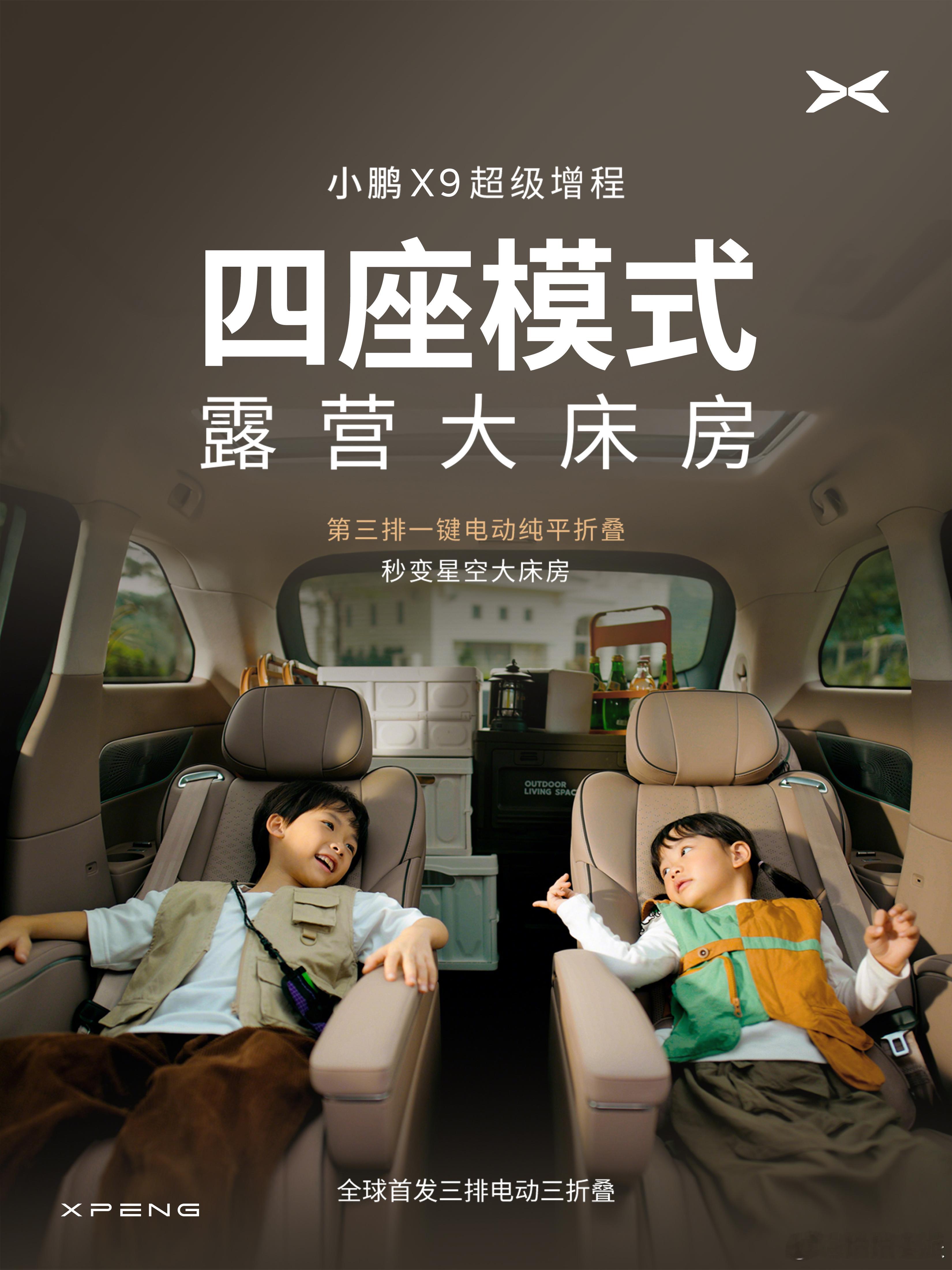 新款小鹏X9首发电动三折叠小鹏X9这个三折叠设计确实把空间玩明白了,一键就能切换四座到七座不同模式,露营、带宠物或者一大家子出行都能灵活安排。