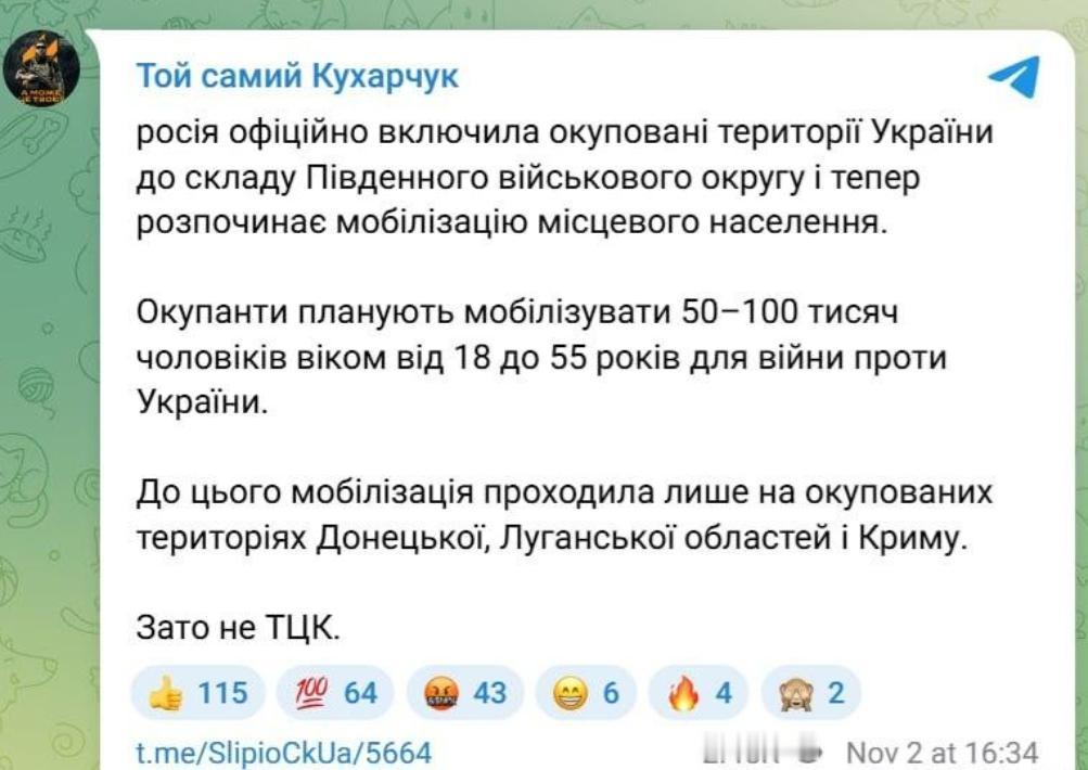乌克兰第三集团军副司令德米特里·库哈尔丘克表示,俄罗斯已开始在乌克兰所有被占领土上动员18-55岁男性。俄罗斯计划征召5万至10万人赴乌参战。 此举发生在普京签署政令,将扎波罗热州、赫尔松州、顿涅茨克州和卢甘斯克州等被占领土“纳入”俄罗斯南方军区之后。 而这一切说白了就是前线实在顶不住了,又不想在本土动真格,只好拿被占土的人当 “补充包”,而把扎波罗热、赫尔松这些地方划进南方军区,不过是给这种征召套个 “合法” 的壳子。 早在 2022 年 2 月,顿涅茨克和卢甘斯克刚闹独立时就玩过这一套,当时直接下了总动员令,18 到 55 岁男性不准离开,还紧急疏散妇女儿童,结果上万人往俄罗斯跑,把边境的罗斯托夫州都逼得宣布紧急状态。 那次动员看着声势大,实际效果却一言难尽,不少人连像样的训练都没有就被推上战场,说白了就是填战线的 “炮灰”。 现在把范围扩大到所有被占土,不过是把当年的老套路复制粘贴,只不过这次有了 “纳入南方军区” 的新名头,毕竟按俄罗斯的法律,自家军区管辖的 “领土” 搞动员,听着比之前的 “民间征召” 顺耳多了。 之所以非得盯着被占土的人,核心还是本土动员太费劲。2022 年 9 月俄罗斯搞过一次 30 万预备役动员,结果圣彼得堡这些大城市立马成立征兵委员会,民间还闹出不少抗议,显然动自己人容易伤民心。 反观被占土,话语权攥在俄方手里,征召起来几乎没阻力,简直是 “柿子挑软的捏”。 更关键的是被占土人口基数不算小,顿涅茨克近 500 万,卢甘斯克 240 万,扎波罗热和赫尔松加起来也有几百万,按 18-55 岁男性占比算,凑出 5 到 10 万人不难,毕竟乌克兰 18 到 38 岁年龄段本来就是男多女少,这些人刚好是征召的主力。 这背后其实是俄军摆不上台面的兵力窘境。俄乌打了快三年,战线拉到 2000 多公里,俄军早就捉襟见肘了。 2021 年俄军现役才 115 万左右,后来扩编到 132 万,可面对乌军百万兵力加上欧盟培训的 1.6 万军人,还有上万外国雇佣兵,这点人根本不够用。 有分析说俄军人员短缺 2025 年要到顶峰,现在不抓紧补人,前线的推进势头就得断了,毕竟 2024 年俄军能占 414 平方公里土地,靠的就是人多堆出来的优势。 更尴尬的是俄军装备损耗也大,乌克兰那边都承认损失了 50% 重武器,俄军的装备缺口只会更大,没法给新兵配齐装备,自然只能从被占土 “就地取材”,反正这些人有没有装备、会不会打仗,先拉到前线填坑再说。 不过这种动员注定是治标不治本的权宜之计。之前顿巴斯动员的人,不少拿着自动步枪就上了战场,说好的坦克根本没影,结果要么弃守要么逃跑,跟乌克兰 123 旅逃兵的处境差不了多少。 这些被占土的男性本就不是自愿参战,让他们打自己国家的军队,士气可想而知,说不定刚上战场就想着怎么躲起来。 而且只要战争不停,兵力消耗就没完没了,被占土的人力总有榨干的一天,到时候难道还要再扩大动员范围? 更讽刺的是,俄罗斯一边说这些地方是 “自家领土”,一边把当地男性当消耗品,这种操作跟之前公投入俄的套路如出一辙,都是先拿法律名头把地盘圈过来,再变着法儿榨取资源。 可国际上根本不承认这些地方是俄罗斯的,所谓的 “军区管辖”“合法动员”,不过是自欺欺人罢了。 说白了,这 5 到 10 万征召兵,不过是俄军拖延战争的临时工具,既填不上兵力缺口的大坑,也改变不了战场的根本态势,顶多是让这场消耗战能多撑一阵子。