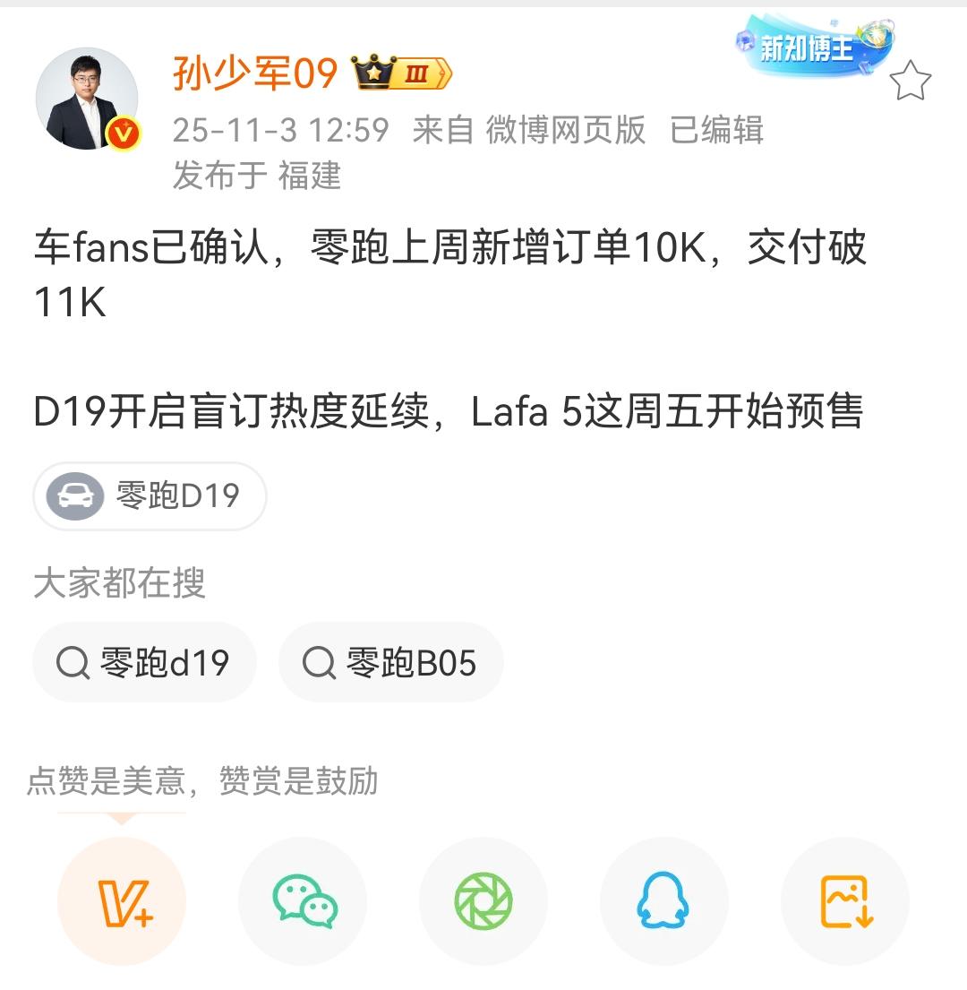 孙少军:零跑汽车上周新增订单1万台!交付量突破1.1万台! 零跑汽车真的是表现的超强,上个月更是破记录的,交出来了7万多辆车,从现在就可以断定零跑今年肯定会完成50万辆的销售目标。 在2019年的时候零跑的创始人朱总,向外界公布2025年销量突破50万,那时候大家还以为他在开玩笑,毕竟新能源产业这种现象还挺多的,定一个不太实际的目标值。 结果这个看起来不太实际的目标值,今年竟然成功实现了,主要还是零跑汽车脚踏实地在认真做车,推出的产品又叫好又叫座。 各位是怎么看的?欢迎评论区留言。