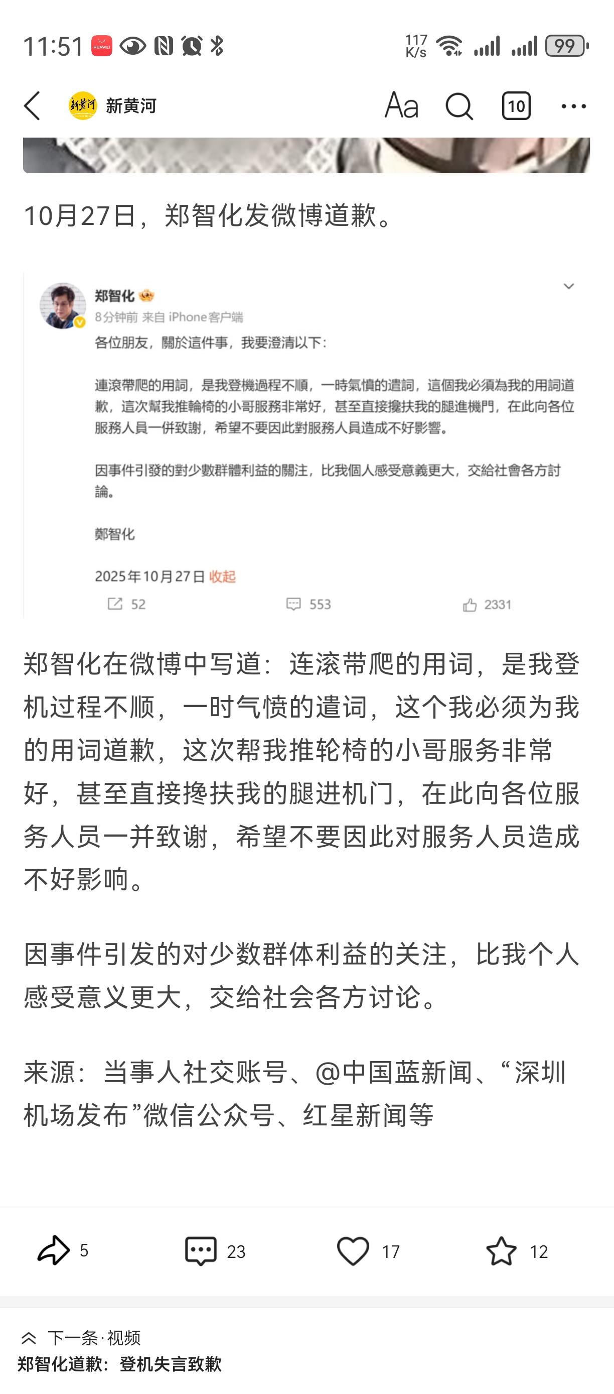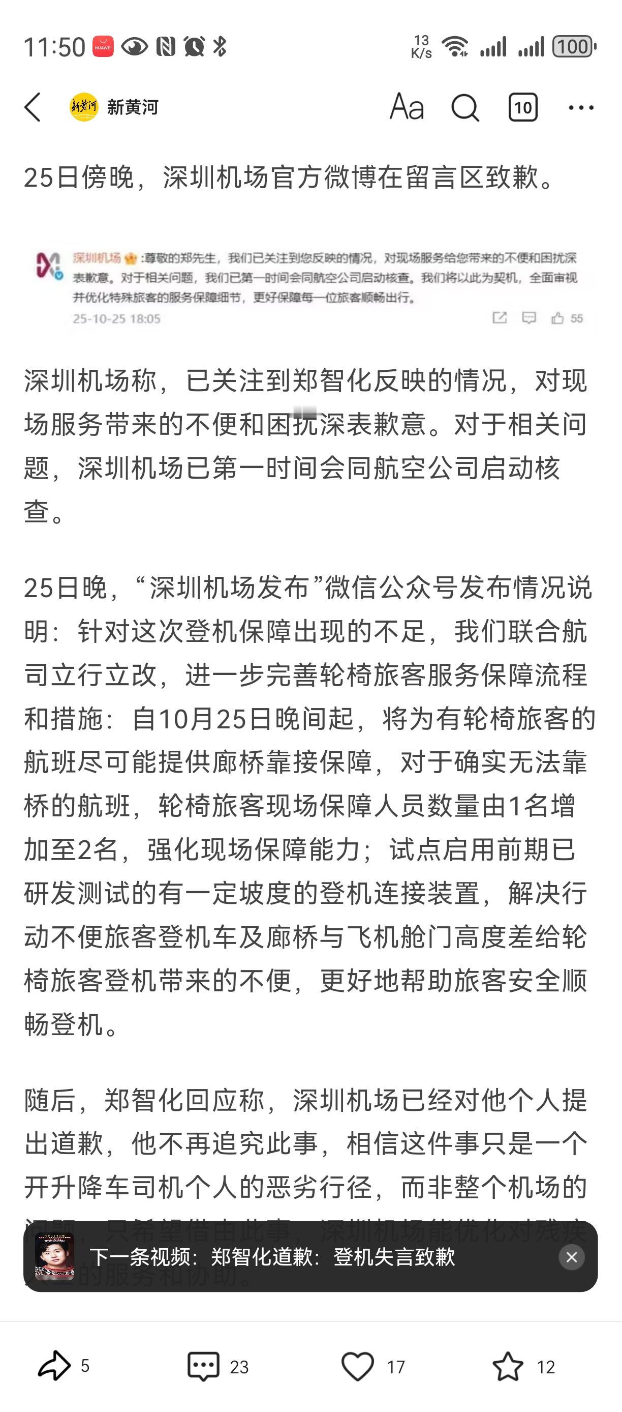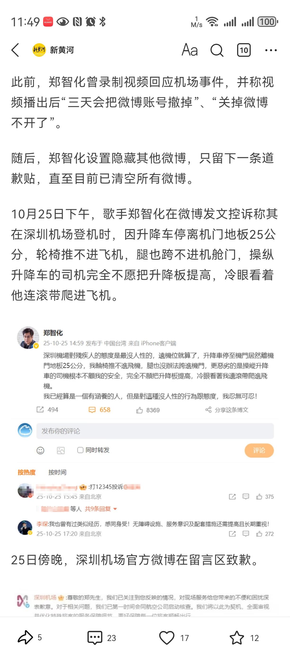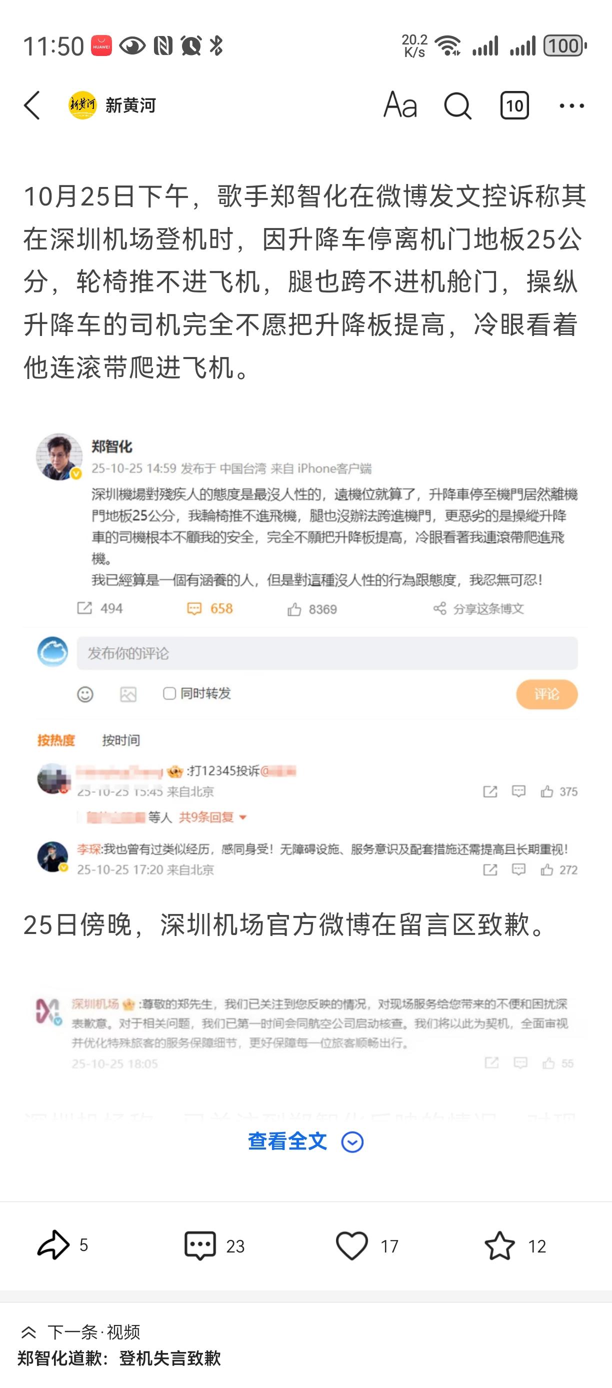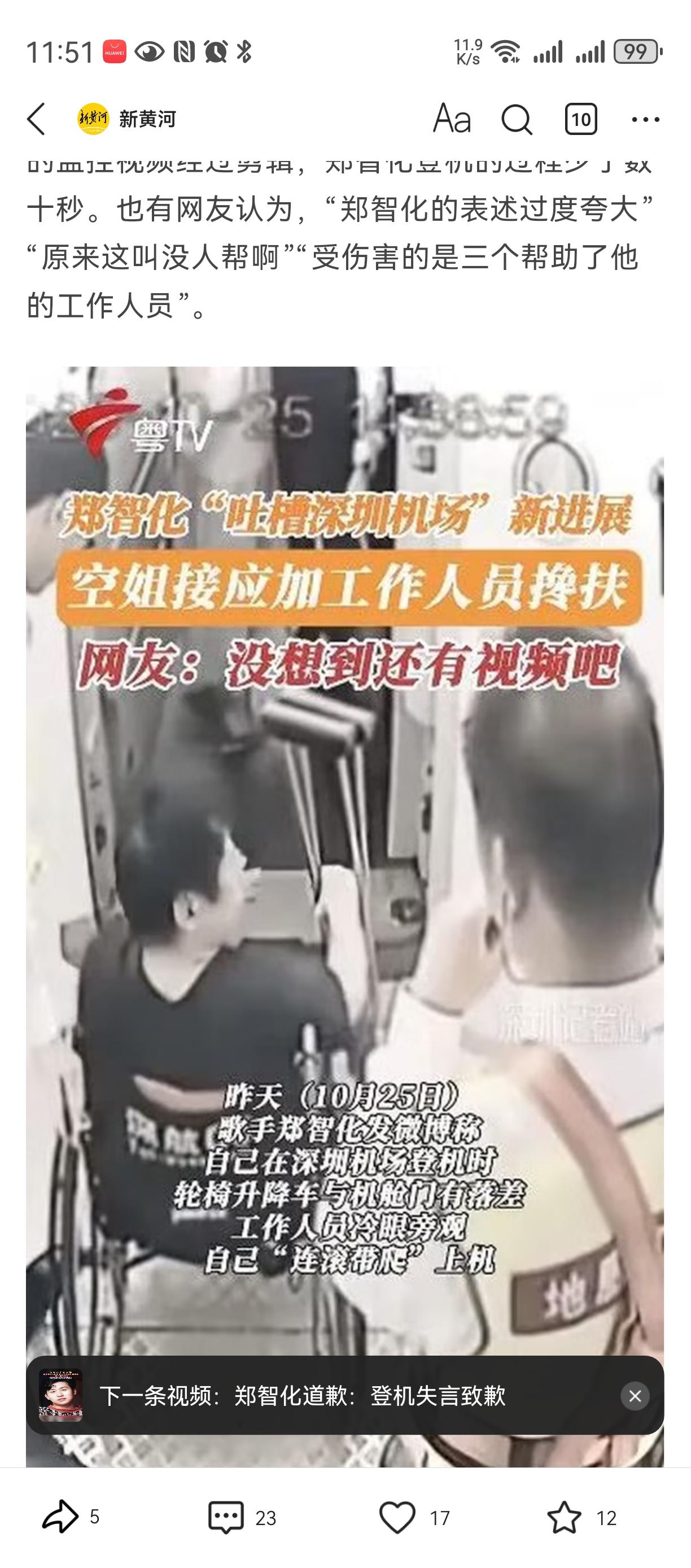 监控太坏了[笑哭][笑哭][笑哭] 本来郑智化可以帮残疾人鼓与呼, 符合他著名歌手身份与社会担当, 也继续展示大陆人文服务存在的不足。 一切都是按照剧本走, 可是但是, 机场把监控视频放出来了, 这深航致歉郑智化 人设翻了, 原来不是连跪带爬, 而是把他宠的不要不要。。。 我相信其它残疾人同样情况, 不一定有他待遇。。。 而且升机不能再升, 否则飞机就要坏掉了。。。。 然后就郑智化删除微博了[大笑][大笑][大笑][大笑]