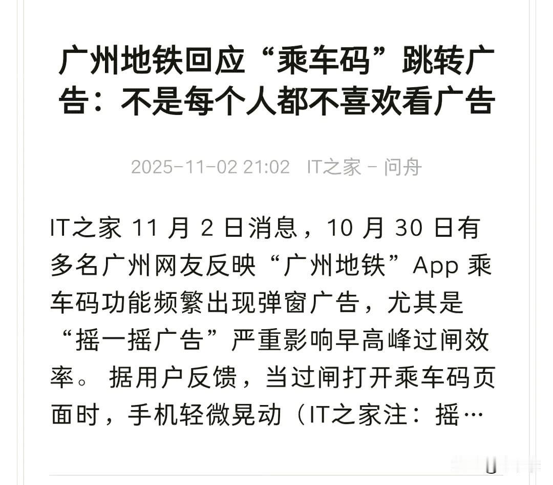 广州多名网友反映,广州地铁APP乘车码功能频繁出现弹窗广告,尤其是“摇一摇”触发方式严重影响早晚高峰过闸效率。 我看准确说是地铁公司喜欢,毕竟能靠广告补贴一下收入,其后果就是遭到市民的反感,哪怕它将广告放在二维码下面都不至于有这么大的意见[吐舌]广州地铁乘车码 广东地铁广告 广州地铁app 广州地铁标语