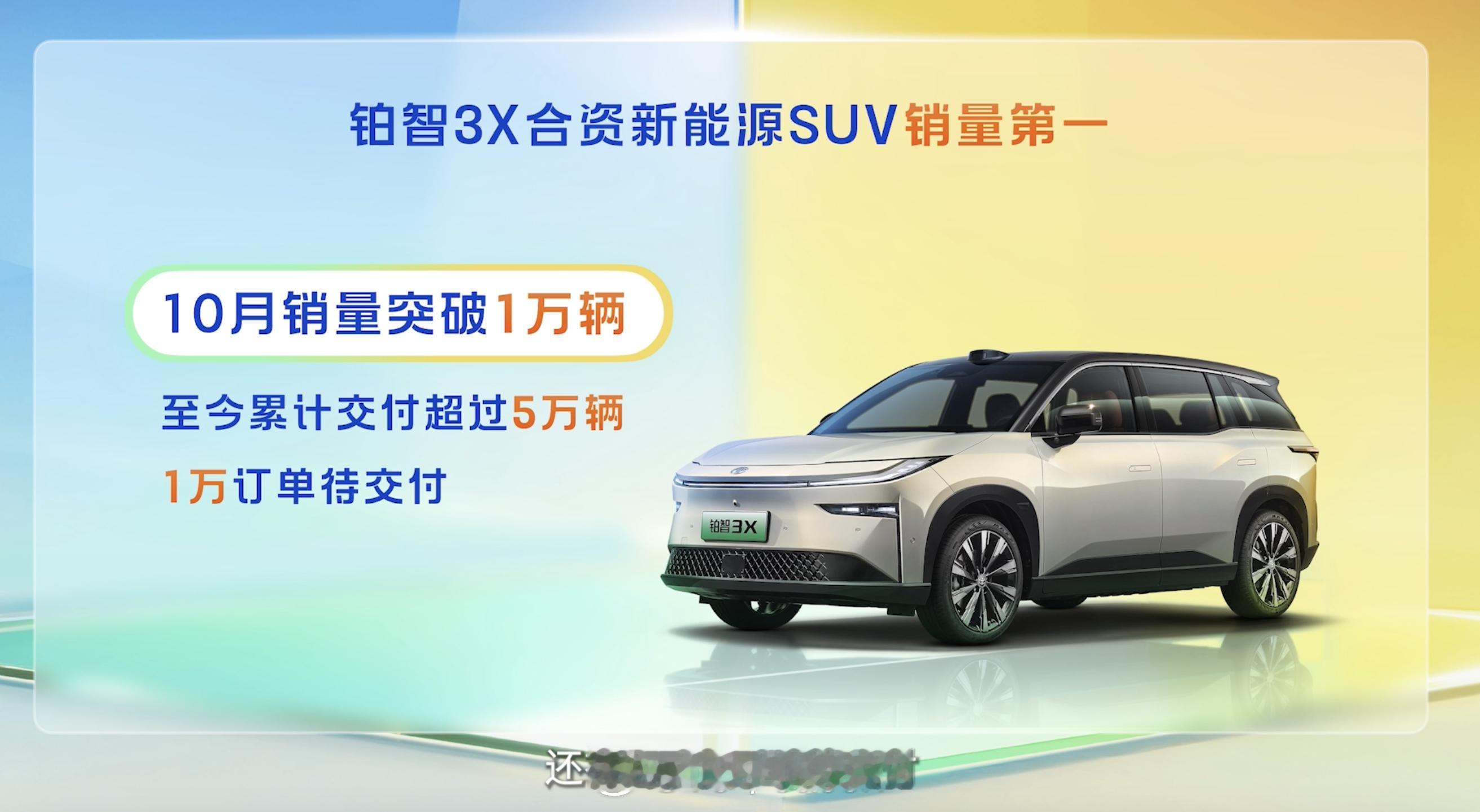 铂智3X月销量破万所以,10 月份销量成绩超出预期,也是合情合理的了——10 月交付 10013 台,首次破万,已连续 6 个月环比增长;累计交付5 万+,尚有1 万订单在途,确实猛。