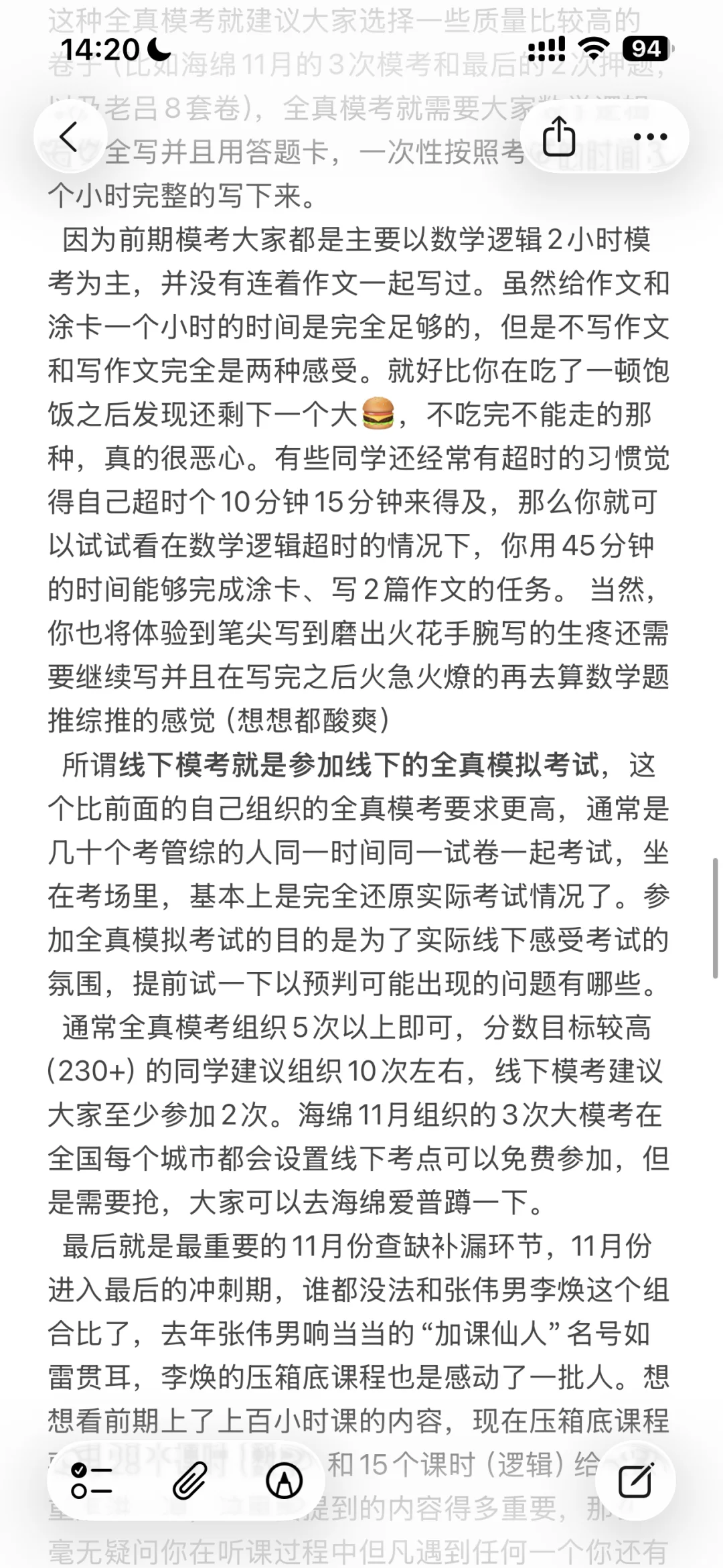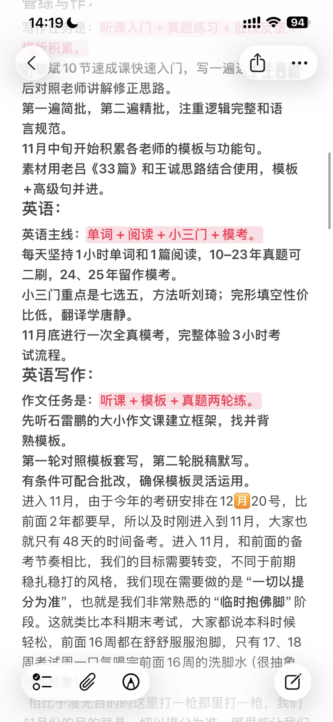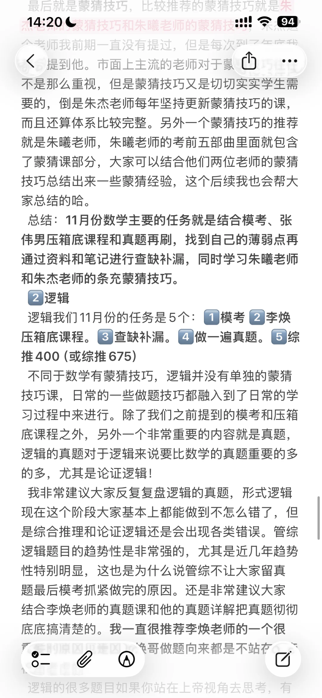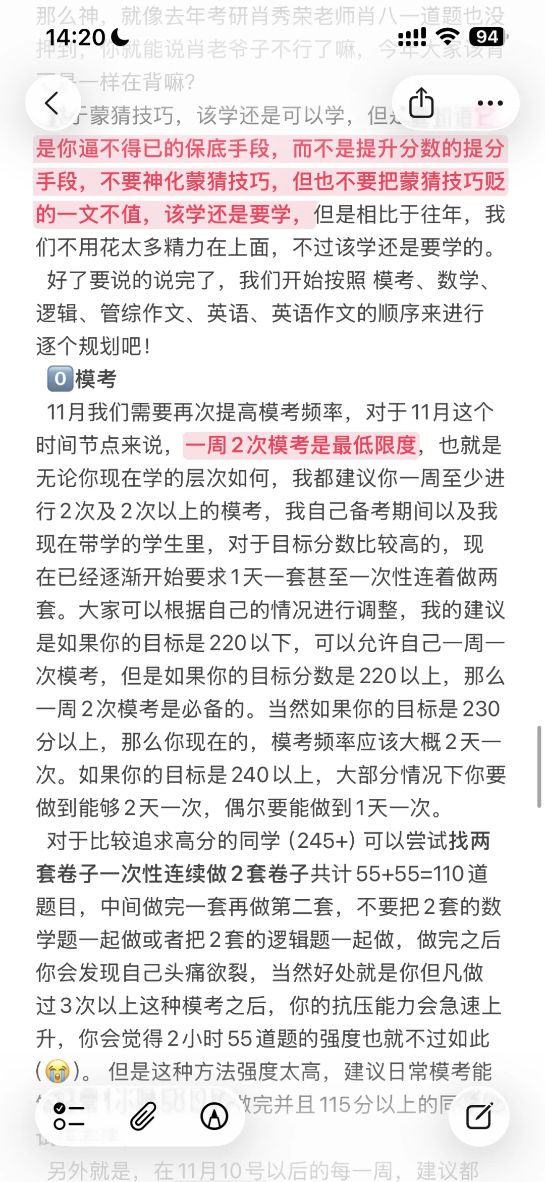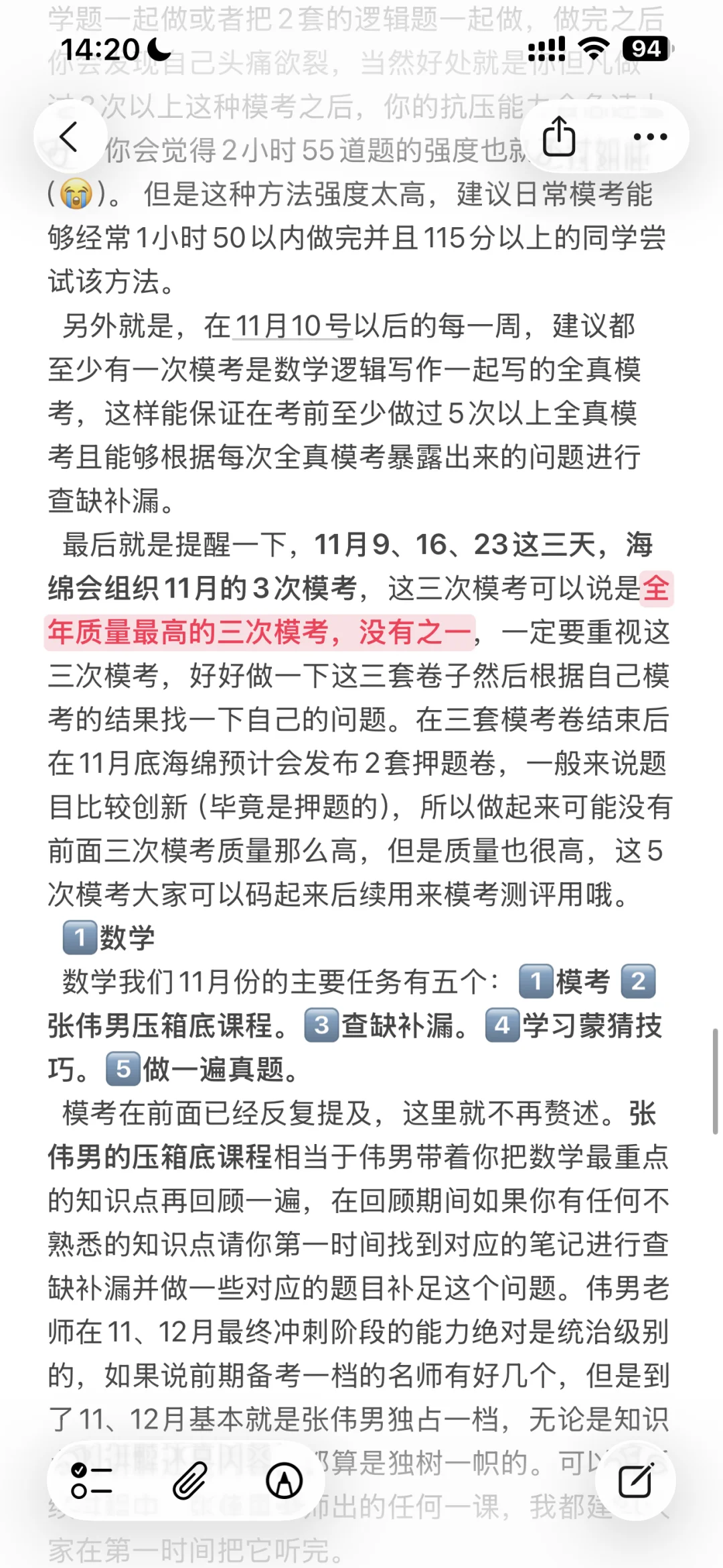 11月备考规划速览:(一句话总结:以提分为目标,模考是主线,压箱底课是关键,真题是根基。数学逻辑提速度,作文英语稳发挥)