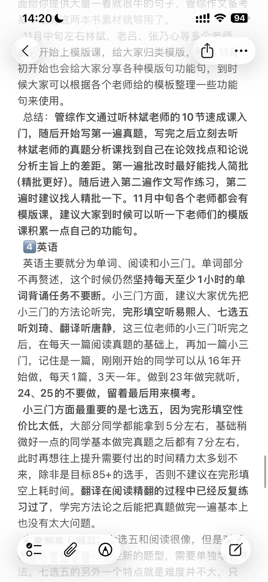 小三门重点是七选五,方法听刘琦;完形填空性价比低,翻译学唐静。