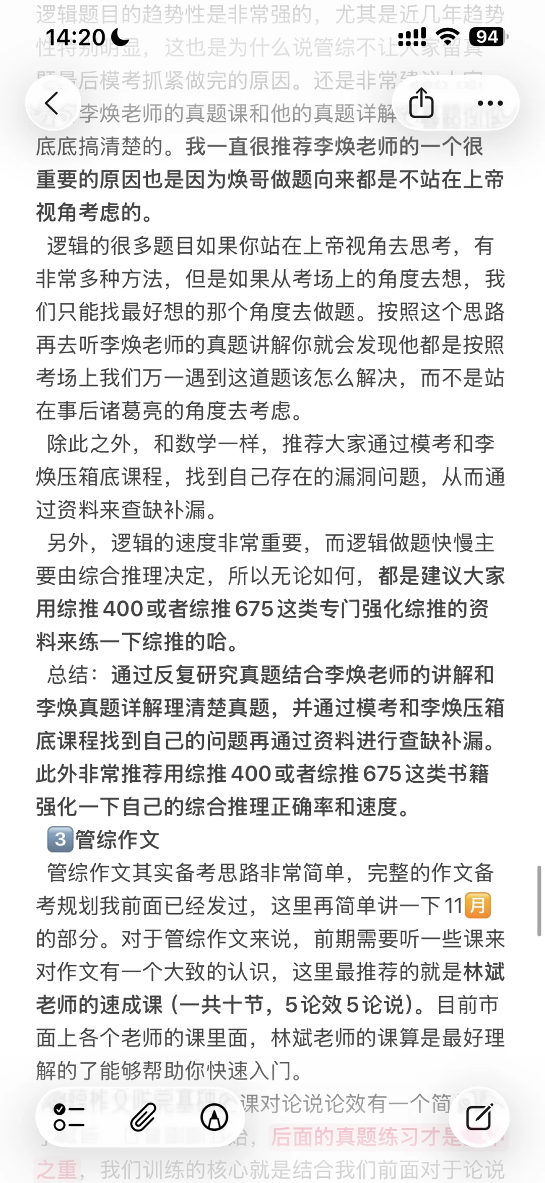 逻辑任务是:模考、李焕压箱底课、真题、查缺补漏、综推训练。