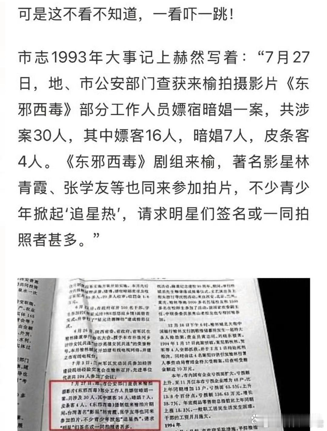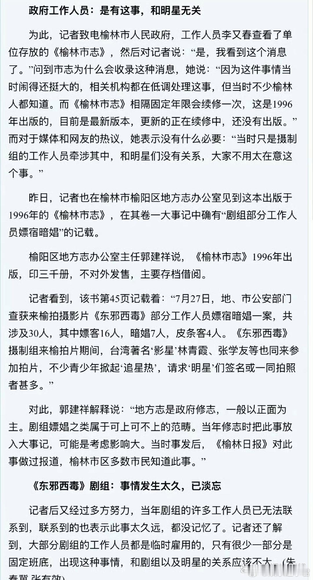 东邪西毒剧组曾嫖娼被抓在1996年出版的官方文献《榆林市志》种,记载了1993年7月27日,《东邪西毒》剧组在陕西榆林拍摄期间,部分工作人员因嫖娼被当地公安部门查处。这个太让人惊讶了。