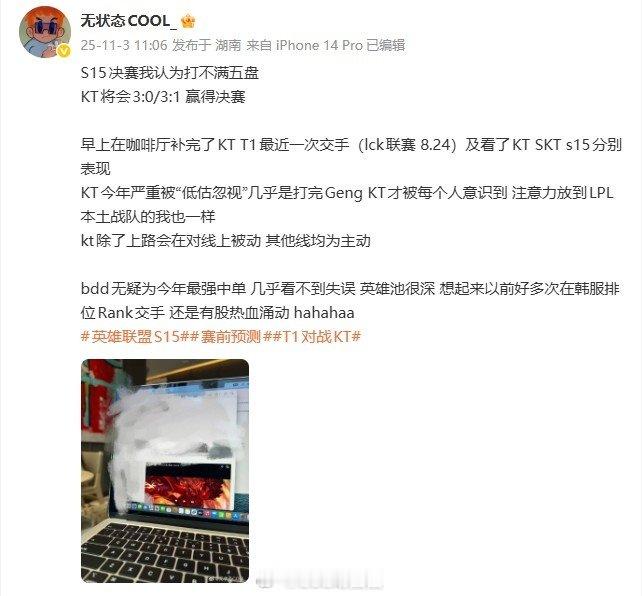 前职业选手无状态Cool发文,谈S15决赛T1对阵KT;