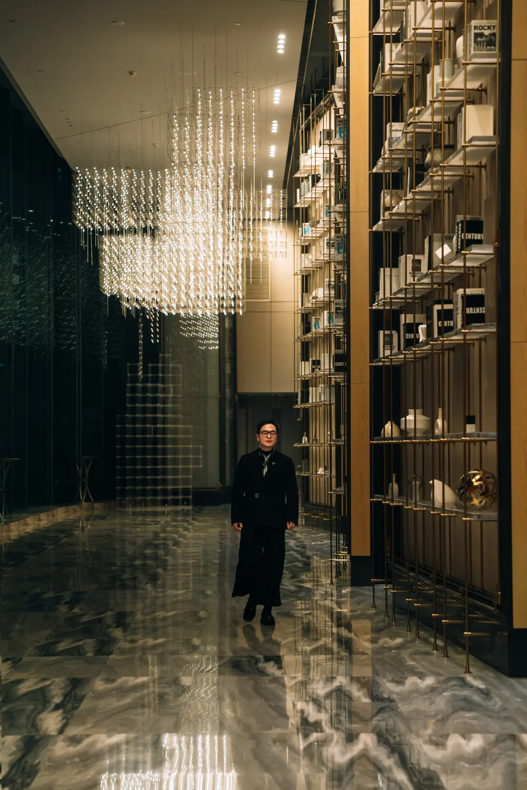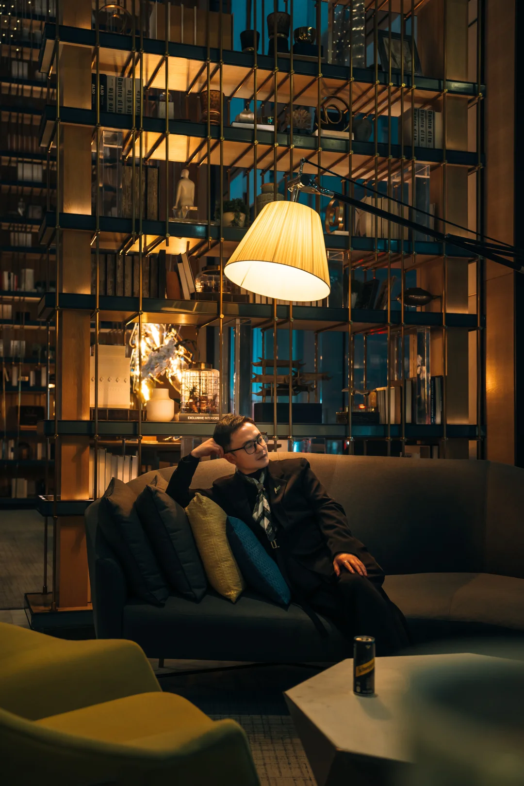 大堂内一道道通高的玻璃屏风和书架将空间分隔成若即若离的区域,利用这些屏风作为前景或背景,借助台灯发出的幽光,可以拍出层次感十足的构图,更能营造出私邸的氛围。