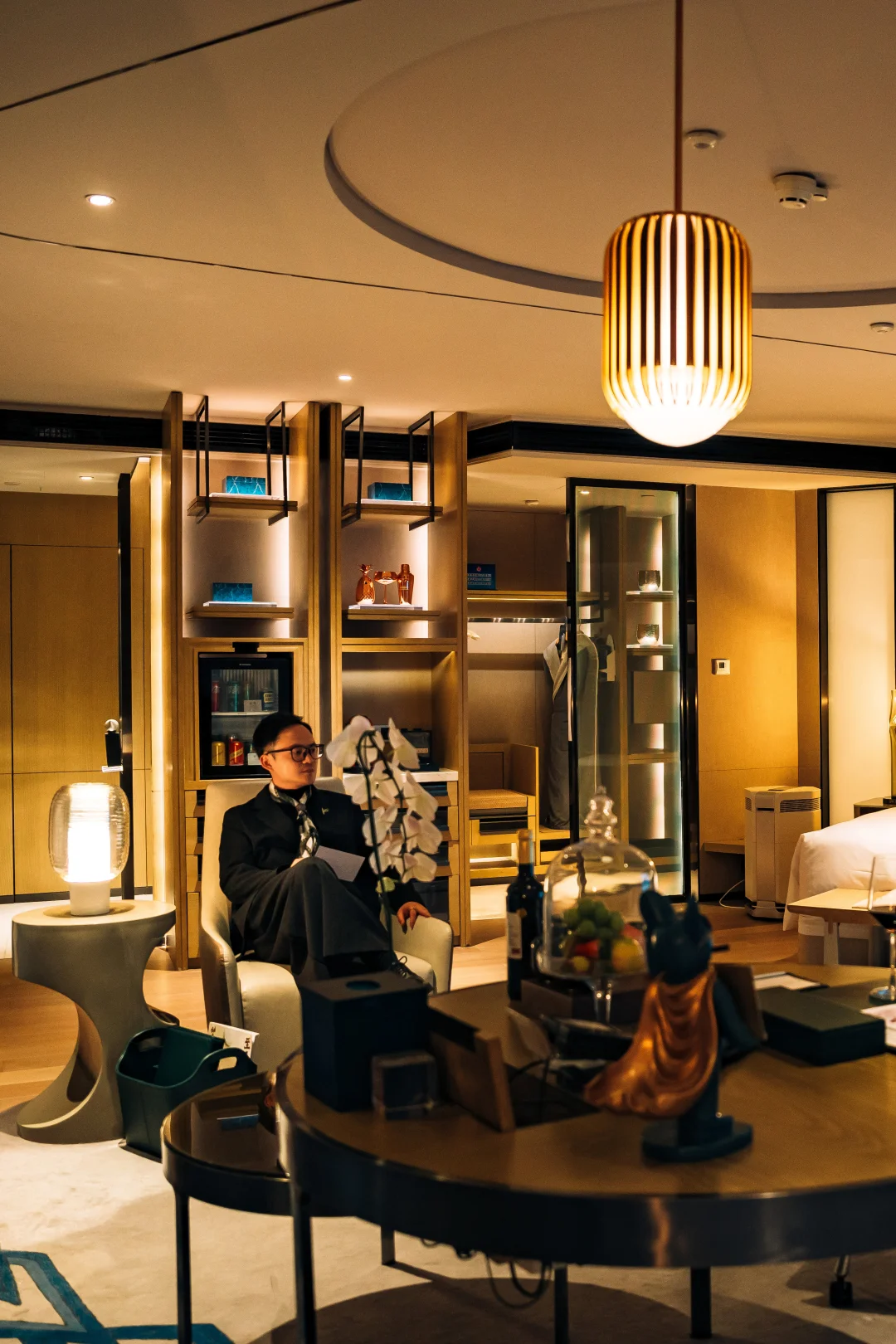 套房内还拥有落地窗前的圆形大浴缸,可以尝试从侧面角度拍摄,将窗外的城市景观与浴缸纳入同一画面,营造出“泡在都市中”的梦幻感。