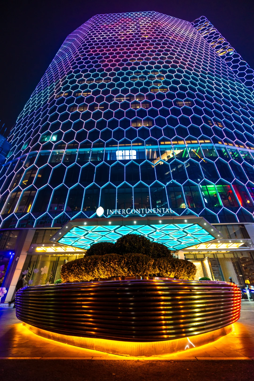 另外酒店门口,可以到马路对面,用广角把整栋建筑的钻石般的六边形外观纹路收入镜头,人可以站在前面当前景。
