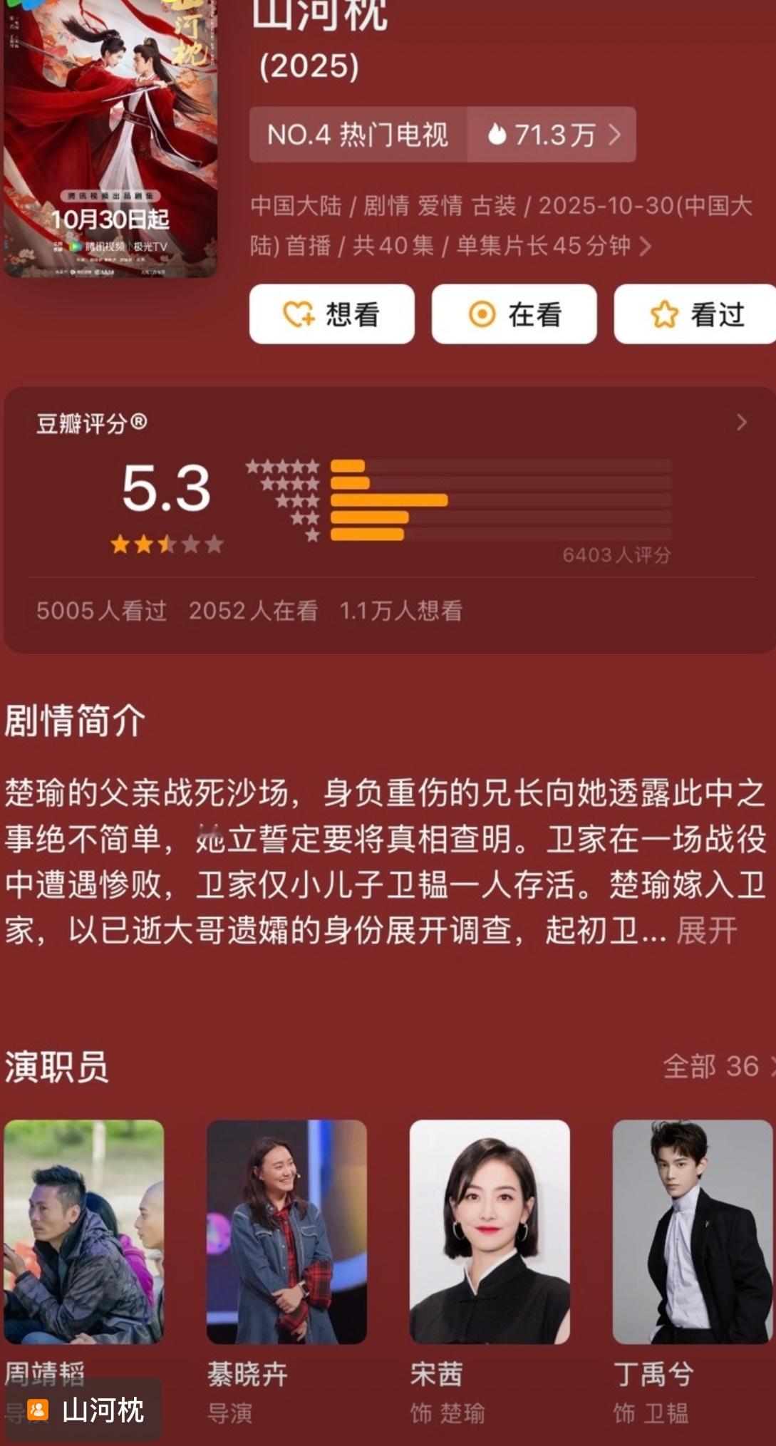 宋茜和丁禹兮主演的山河枕豆瓣开分5.3