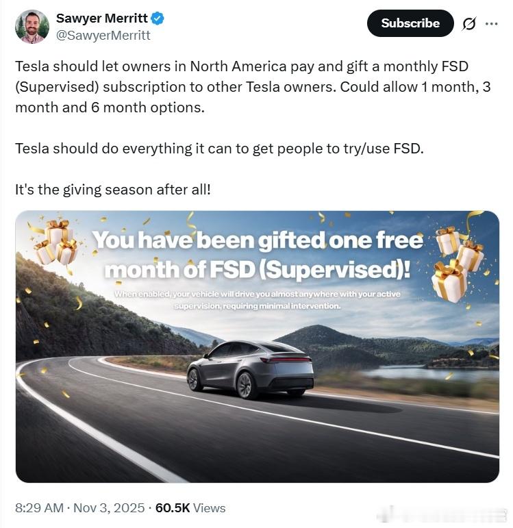 特斯拉将在下个月之前允许车主赠送FSD[doge]