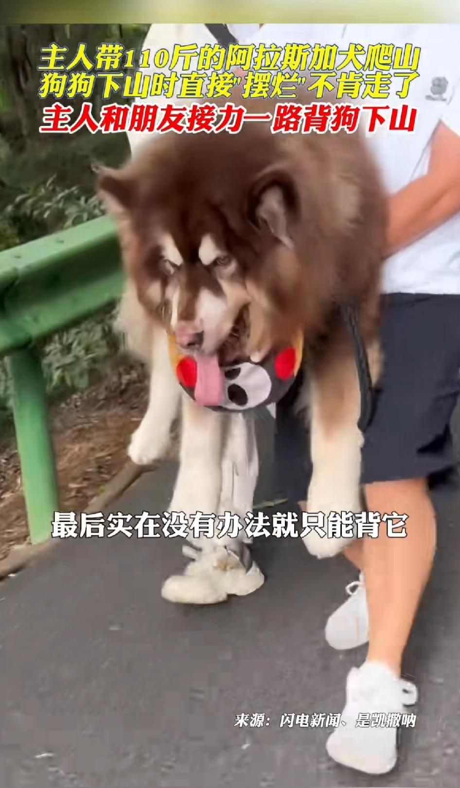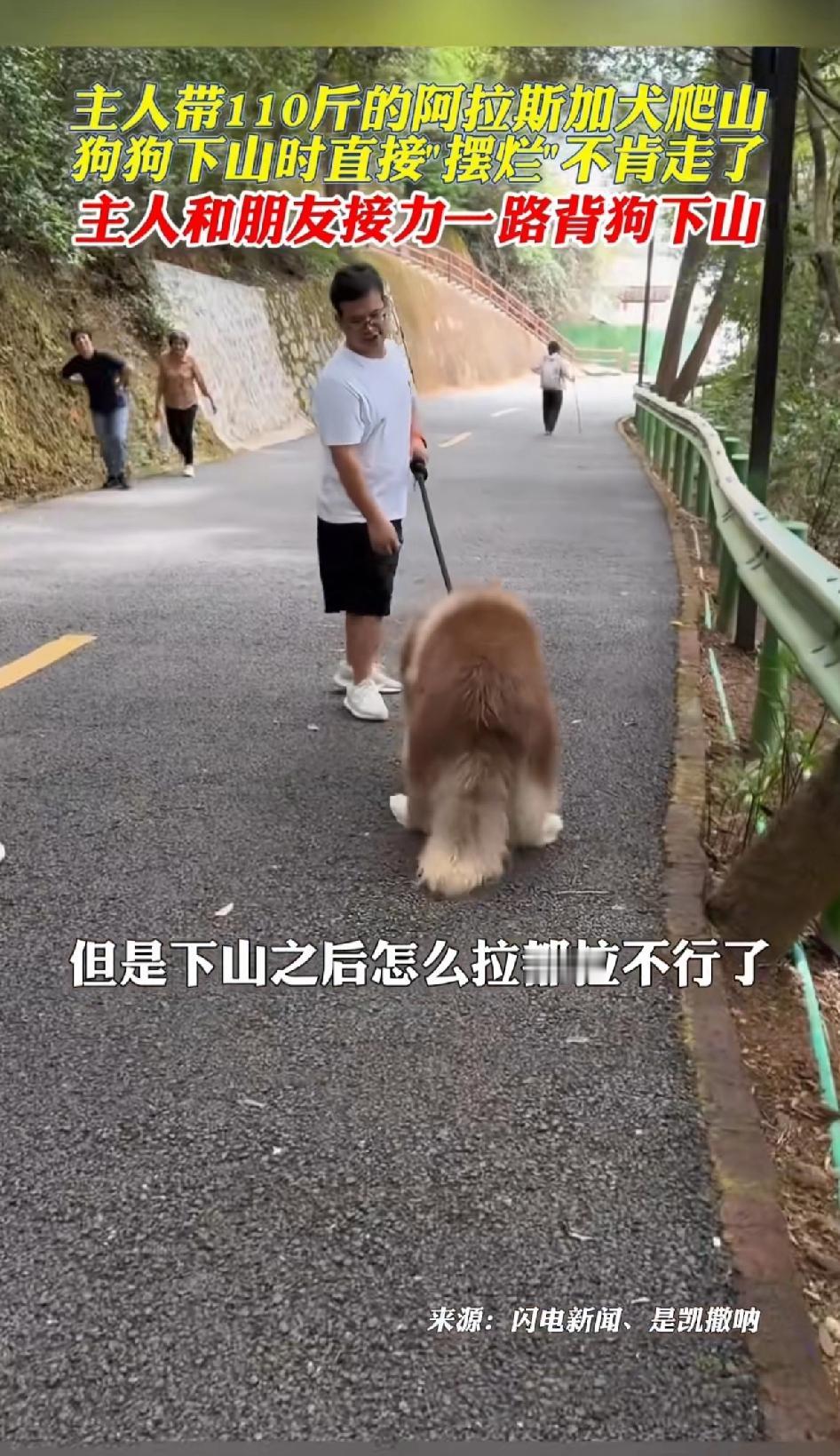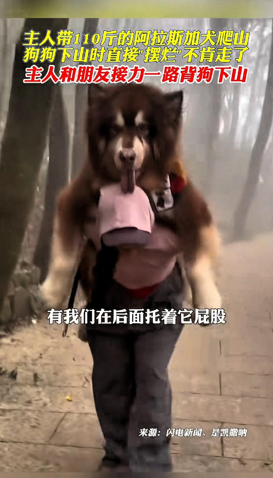 主人带110斤的爱拉斯加犬爬山,狗狗下山时直接“摆烂” 不肯走了! 广东一女生的爬山经历让人忍俊不禁。 理解不了这种行为,为什么要带着狗去爬山?如果把狗留在山上主人自己走了,狗会不会就自己下山了? 看来阿拉斯加犬也是心眼子贼多,知道主人舍不得丢下它,还会拿捏主人! 她带着110斤的阿拉斯加犬去爬山,本想让狗狗陪自己看风景,多有意义的事儿啊。 可下山的时候,这狗狗直接“摆烂”,死活不肯自己走。如果是我爱走不走,我还想找人背着我呐!让我背狗没门! 女生也没辙,只能把这百来斤的“毛孩子”背下山。网友调侃:2块钱的矿泉水拧不动,百十斤的大狗扛起就走。 尤其是有的女生本来就瘦弱,还非要养个大狗当宠物!出门遛狗被狗拉着跑,每当看到那一幕都觉得搞笑,不知道是人遛狗,还是狗遛人! 看来这爱狗的力量真是无穷,不过也能看出女生对狗狗满满的爱,只是不知道她背着狗狗下山时累不累呢?