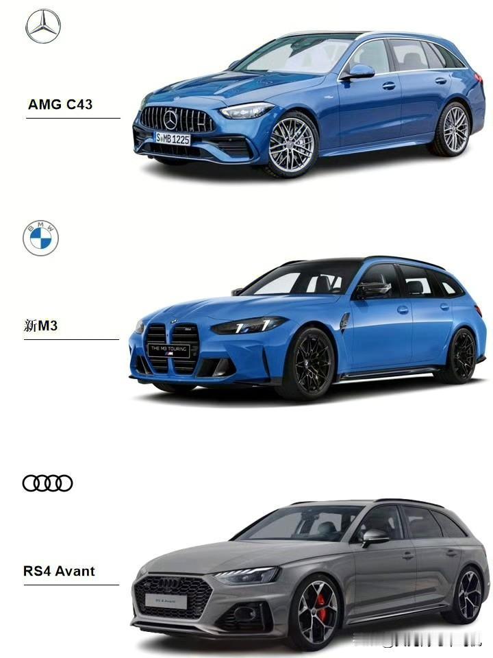 随着宝马M3旅行版国内上市,BBA三家性能瓦罐齐聚,你最喜欢哪台。 AMG奔驰C 43,2.0T 408马力,实用型颜值天花板。 宝马M3旅行版,3.0T,530匹马力,周末下赛道,工作日通勤代步。 奥迪RS4 AVANT 2.9T,450匹马力,遛街神器。 那款是你的菜?