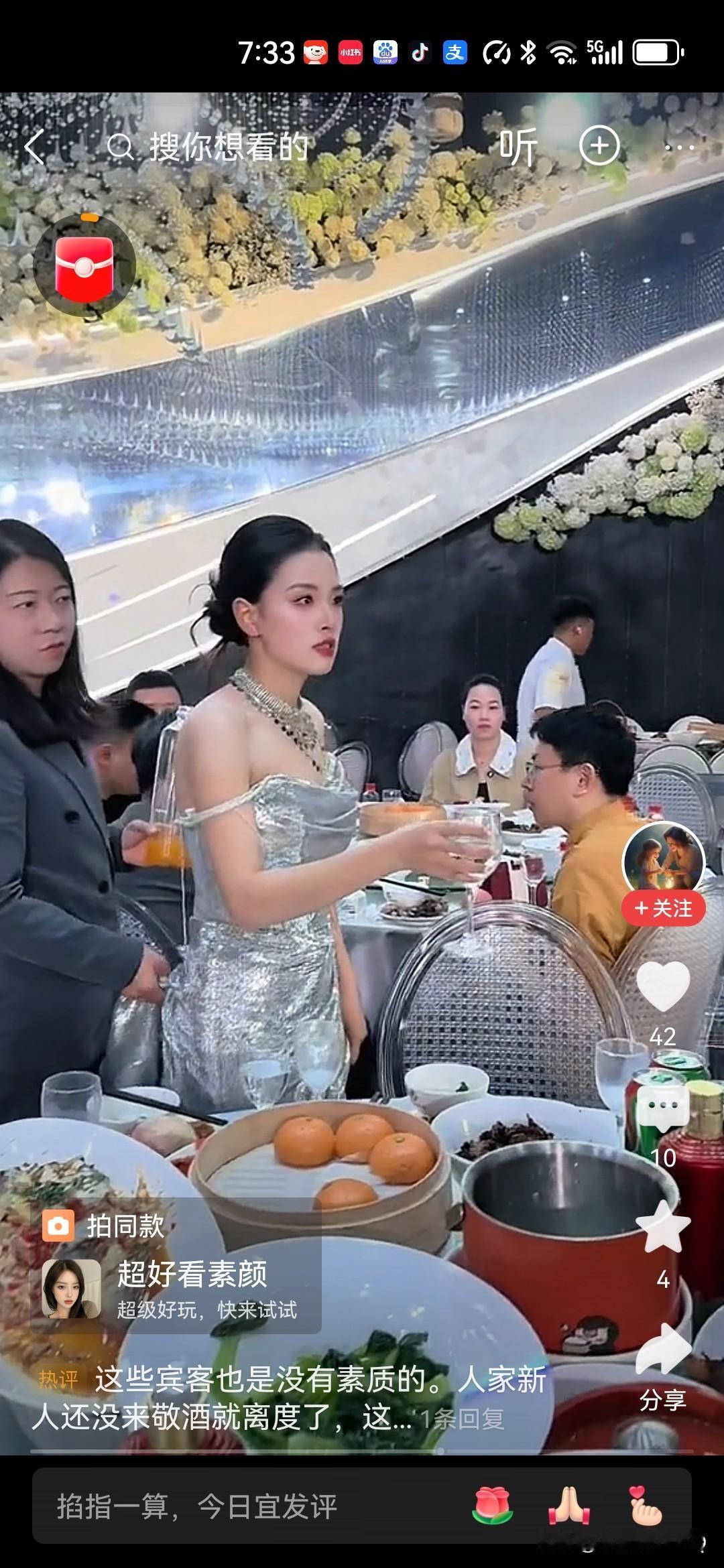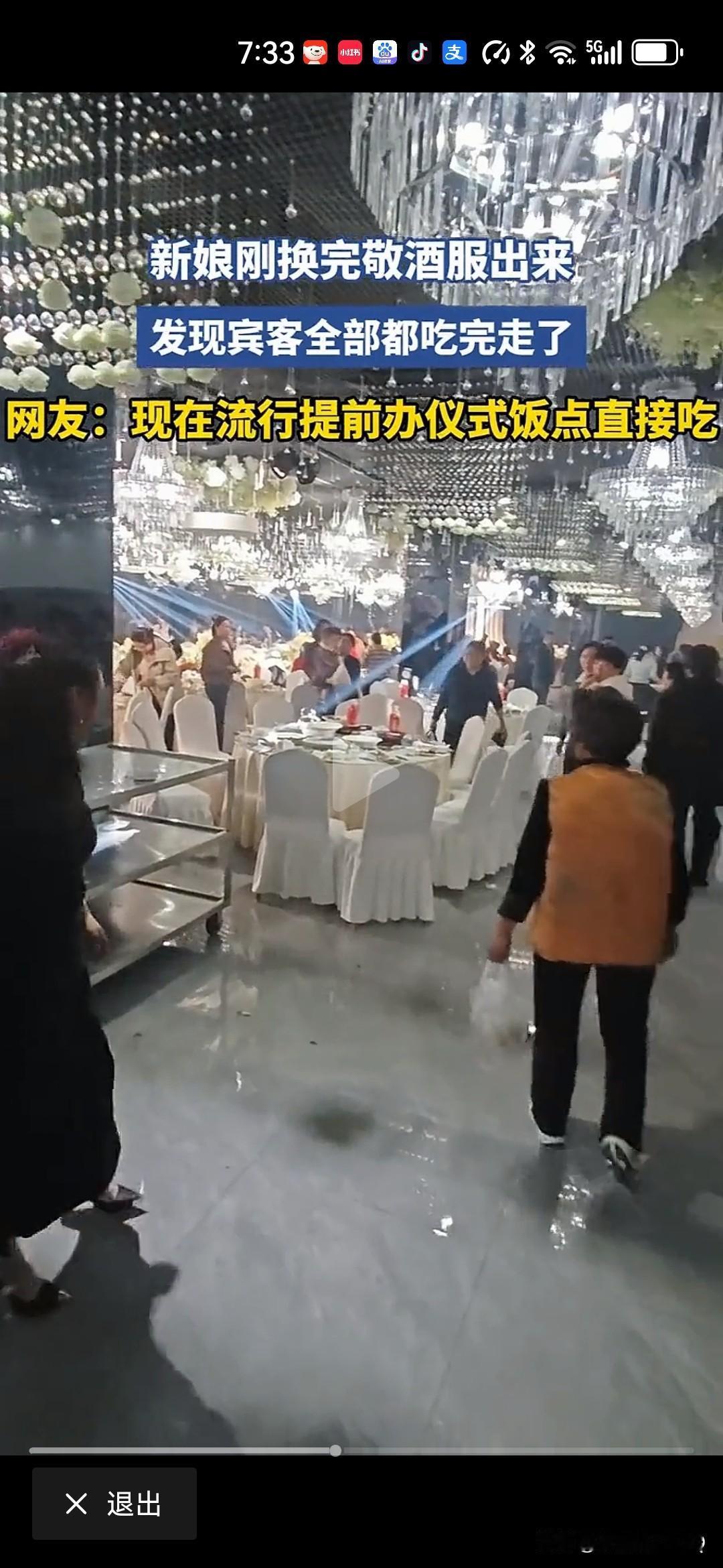 新娘换完敬酒服出来发现宾客全走了!结婚需要仪式感,今天我最靓,我是人生的第一次女主角,所以化个靓女妆出来敬酒,化也化,40分钟才化个好妆,满心欢喜出来敬酒,但大家都走了,婚宴的落幕慰籍一下子空荡荡的酒杯在大厅找不到敬酒人,泪水洒满婚纱,怎么就不等一下!而楼席的人也是百忙中抽出时间来参加,匆匆忙忙赶回的!主人家全怪酒楼怎么把最后一道菜馒头上了,让人家误会婚宴结束,要负责!但酒楼按照上菜程序,没有顾及你的晚礼服时间!